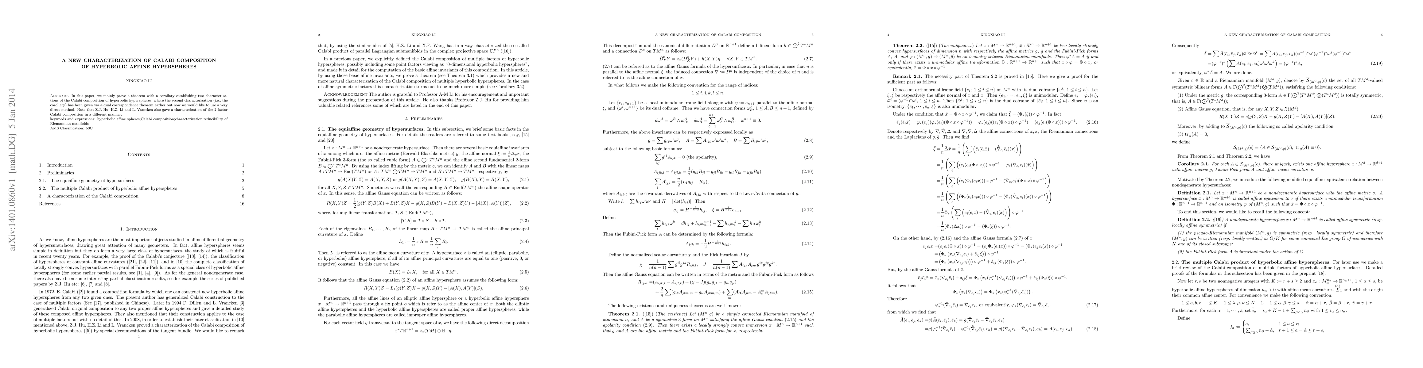 This paper proves a theorem with a corollary that provides two new characterizations of the Calabi composition of hyperbolic affine hyperspheres, using a more direct method compared to previous dual correspondence approaches. It also references a different characterization by Z.J. Hu, H.Z. Li, and L. Vrancken.
