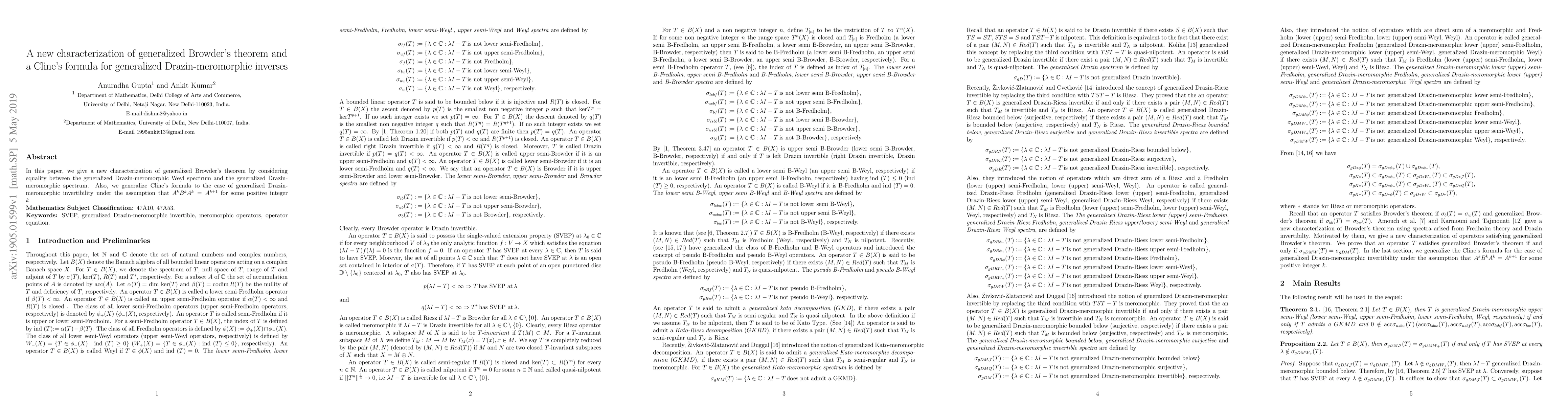 This paper introduces a new characterization of generalized Browder's theorem using the equality between generalized Drazin-meromorphic Weyl spectrum and spectrum, and generalizes Cline's formula for generalized Drazin-meromorphic invertibility under specific conditions.