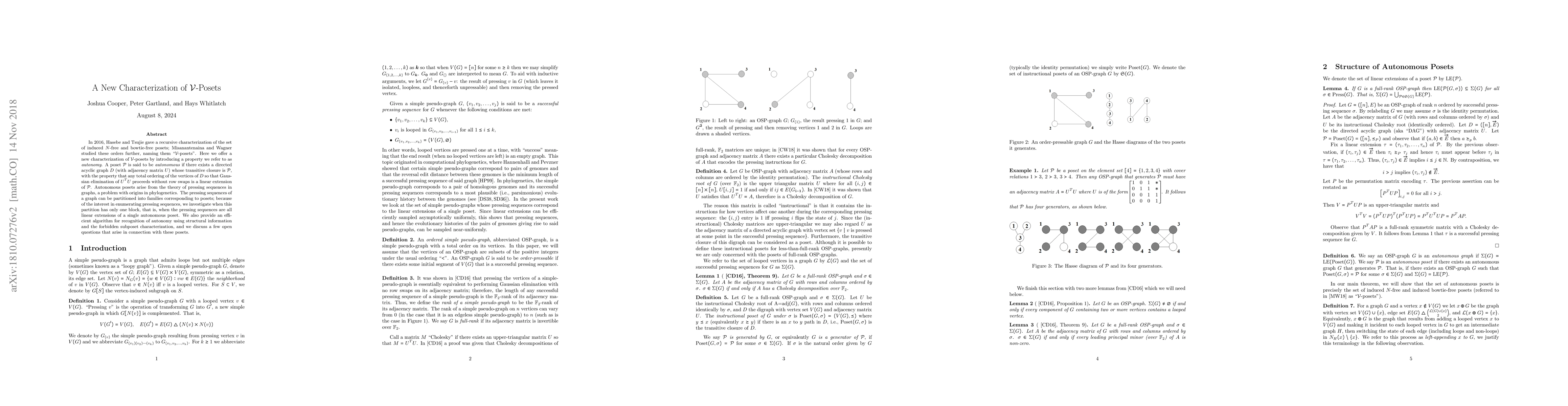 In 2016, Hasebe and Tsujie gave a recursive characterization of the set of induced $N$-free and bowtie-free posets; Misanantenaina and Wagner studied these orders further, naming them "$\mathcal{V}$-posets". Here we offer a new characterization of $\mathcal{V}$-posets by introducing a property we refer to as autonomy. A poset $\cP$ is said to be autonomous if there exists a directed acyclic graph $D$ (with adjacency matrix $U$) whose transitive closure is $\cP$, with the property that any total ordering of the vertices of $D$ so that Gaussian elimination of $U^TU$ proceeds without row swaps is a linear extension of $\cP$. Autonomous posets arise from the theory of pressing sequences in graphs, a problem with origins in phylogenetics. The pressing sequences of a graph can be partitioned into families corresponding to posets; because of the interest in enumerating pressing sequences, we investigate when this partition has only one block, that is, when the pressing sequences are all linear extensions of a single autonomous poset. We also provide an efficient algorithm for recognition of autonomy using structural information and the forbidden subposet characterization, and we discuss a few open questions that arise in connection with these posets.