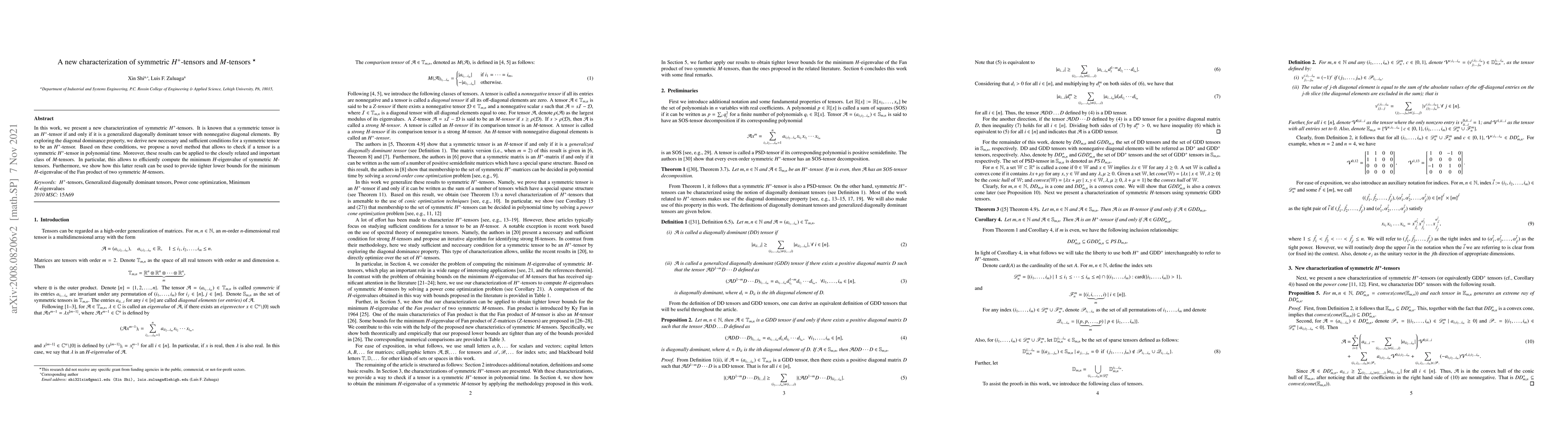 In this work, we present a new characterization of symmetric $H^+$-tensors. It is known that a symmetric tensor is an $H^+$-tensor if and only if it is a generalized diagonally dominant tensor with nonnegative diagonal elements. By exploring the diagonal dominance property, we derive new necessary and sufficient conditions for a symmetric tensor to be an $H^+$-tensor. Based on these conditions, we propose a novel method that allows to check if a tensor is a symmetric $H^+$-tensor in polynomial time. Moreover, these results can be applied to the closely related and important class of $M$-tensors. In particular, this allows to efficiently compute the minimum $H$-eigenvalue of symmetric $M$-tensors. Furthermore, we show how this latter result can be used to provide tighter lower bounds for the minimum $H$-eigenvalue of the Fan product of two symmetric $M$-tensors.