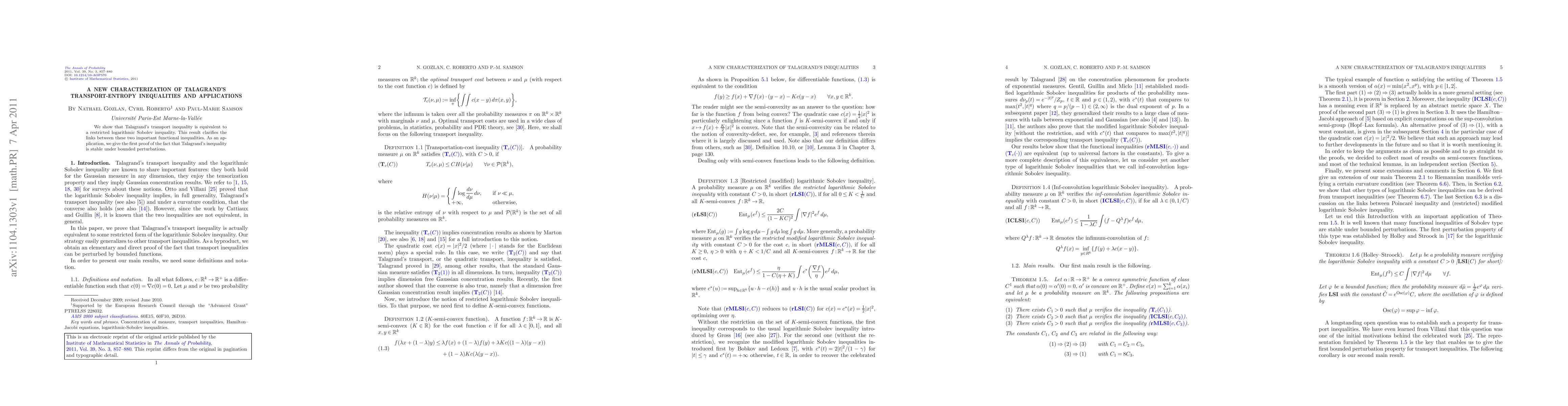 Summary: This paper establishes the equivalence between Talagrand's transport inequality and a restricted logarithmic Sobolev inequality, elucidating their connections. It also provides the first proof of Talagrand's inequality's stability under bounded perturbations.