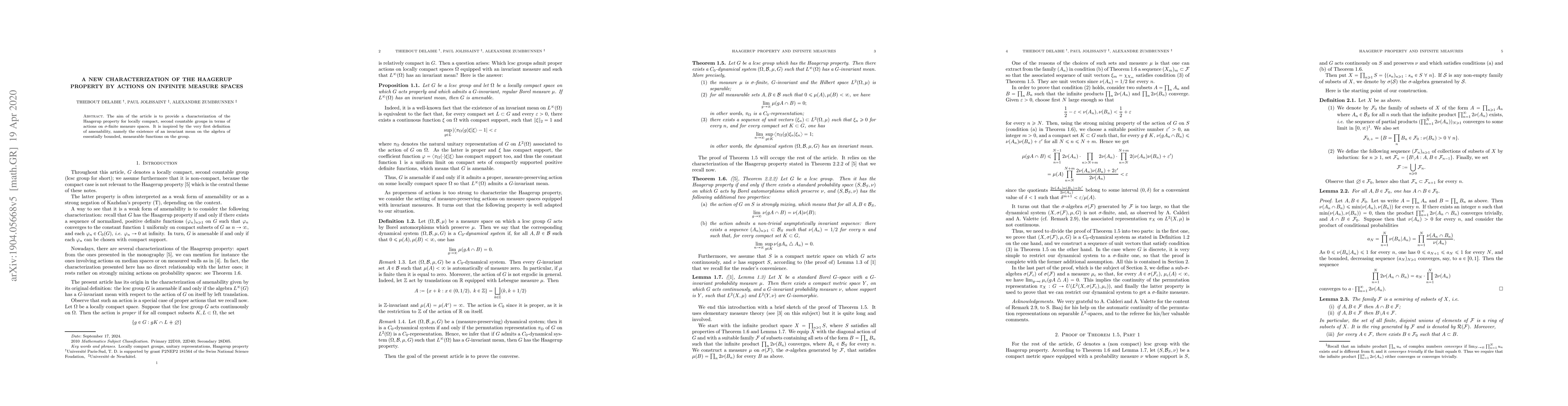 The paper characterizes the Haagerup property for locally compact, second countable groups in terms of their actions on $\sigma$-finite measure spaces, drawing inspiration from the original definition of amenability involving invariant means. This new characterization provides a deeper understanding of the Haagerup property.