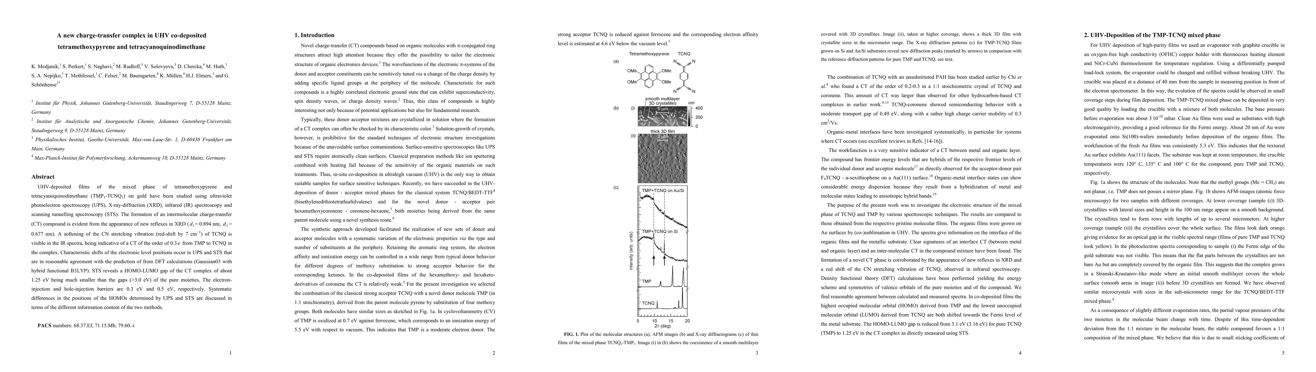 UHV-deposited films of the mixed phase of tetramethoxypyrene and tetracyanoquinodimethane (TMP1-TCNQ1) on gold have been studied using ultraviolet photoelectron spectroscopy (UPS), X-ray-diffraction (XRD), infrared (IR) spectroscopy and scanning tunnelling spectroscopy (STS). The formation of an intermolecular charge-transfer (CT) compound is evident from the appearance of new reflexes in XRD (d1= 0.894 nm, d2= 0.677 nm). A softening of the CN stretching vibration (red-shift by 7 cm-1) of TCNQ is visible in the IR spectra, being indicative of a CT of the order of 0.3e from TMP to TCNQ in the complex. Characteristic shifts of the electronic level positions occur in UPS and STS that are in reasonable agreement with the prediction of from DFT calculations (Gaussian03 with hybrid functional B3LYP). STS reveals a HOMO-LUMO gap of the CT complex of about 1.25 eV being much smaller than the gaps (>3.0 eV) of the pure moieties. The electron-injection and hole-injection barriers are 0.3 eV and 0.5 eV, respectively. Systematic differences in the positions of the HOMOs determined by UPS and STS are discussed in terms of the different information content of the two methods.