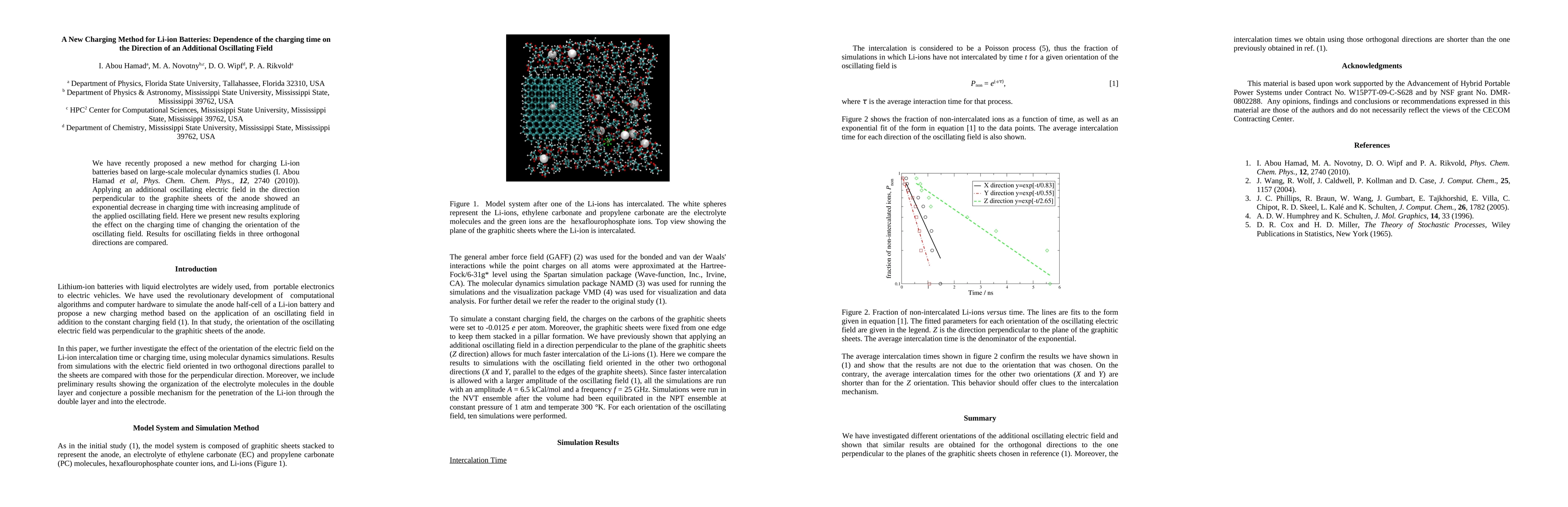 This study investigates a novel charging method for Li-ion batteries using an additional oscillating electric field, finding that the charging time significantly decreases with increased amplitude. New results explore the impact of the oscillating field's orientation, comparing charging times for fields applied in three orthogonal directions.