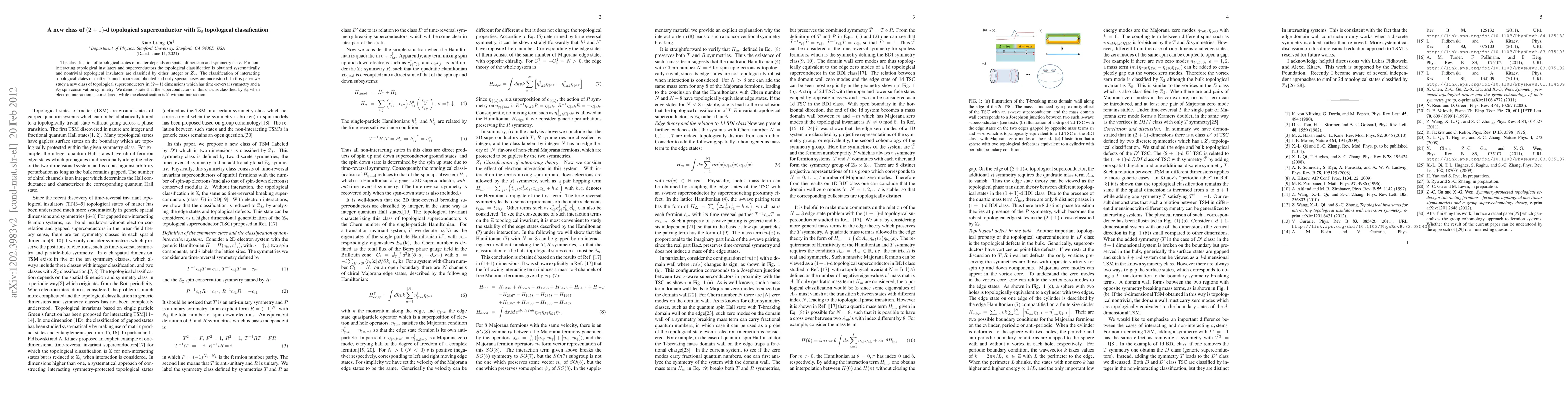 The classification of topological states of matter depends on spatial dimension and symmetry class. For non-interacting topological insulators and superconductors the topological classification is obtained systematically and nontrivial topological insulators are classified by either integer or $Z_2$. The classification of interacting topological states of matter is much more complicated and only special cases are understood. In this paper we study a new class of topological superconductors in $(2+1)$ dimensions which has time-reversal symmetry and a $\mathbb{Z}_2$ spin conservation symmetry. We demonstrate that the superconductors in this class is classified by $\mathbb{Z}_8$ when electron interaction is considered, while the classification is $\mathbb{Z}$ without interaction.