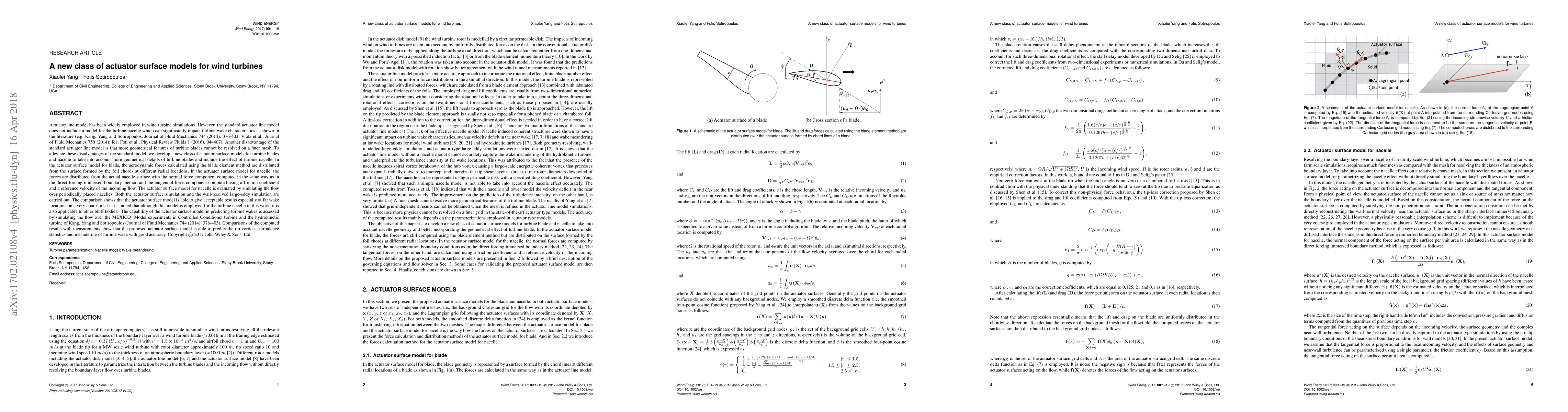 This paper introduces a new class of actuator surface models for wind turbines that incorporate detailed geometrical features of turbine blades and the nacelle, addressing limitations of the standard actuator line model. The new model distributes aerodynamic forces from blade and nacelle surfaces, showing acceptable results in predicting turbine wakes, especially on coarse meshes.