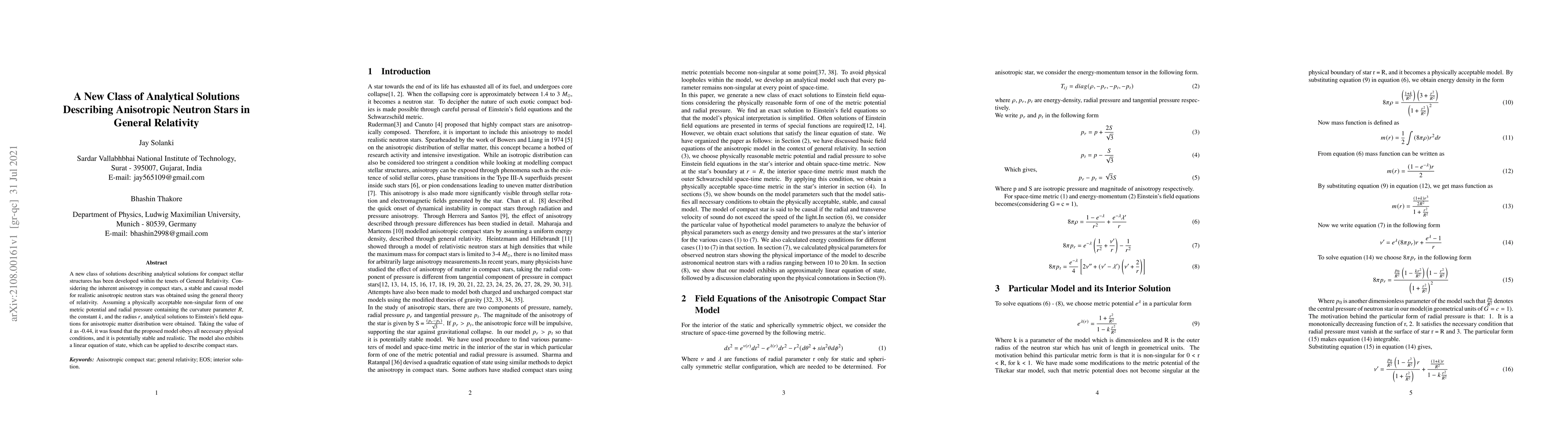 This paper presents a new analytical solution within General Relativity for anisotropic neutron stars, incorporating a non-singular metric potential and radial pressure. The proposed model, with a constant $k$ value of -0.44, satisfies all physical conditions and suggests stability and realism, featuring a linear equation of state applicable to compact stars.