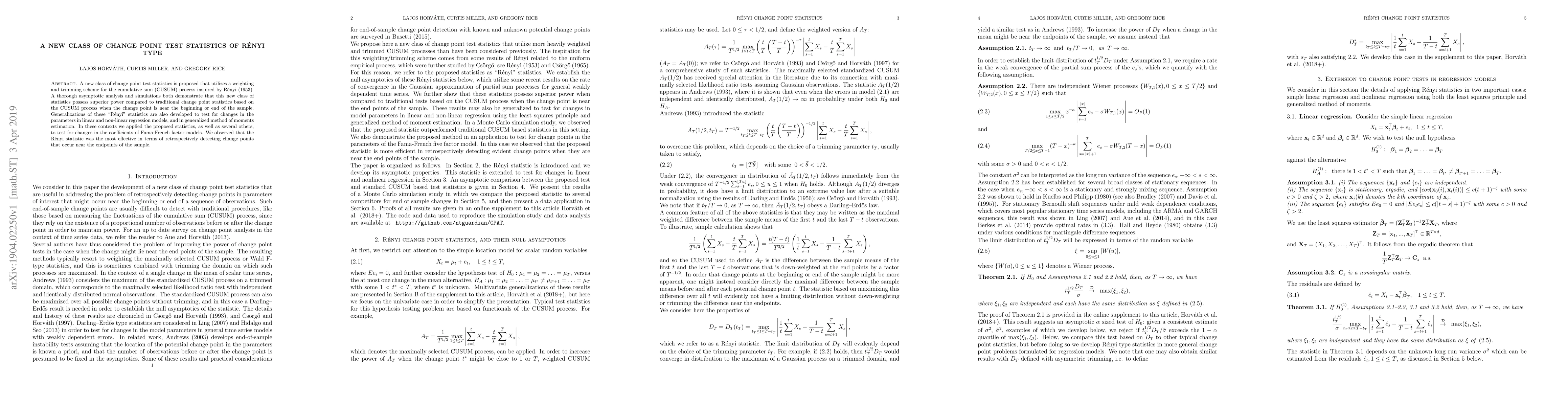 A new class of change point test statistics is proposed that utilizes a weighting and trimming scheme for the cumulative sum (CUSUM) process inspired by R\'enyi (1953). A thorough asymptotic analysis and simulations both demonstrate that this new class of statistics possess superior power compared to traditional change point statistics based on the CUSUM process when the change point is near the beginning or end of the sample. Generalizations of these "R\'enyi" statistics are also developed to test for changes in the parameters in linear and non-linear regression models, and in generalized method of moments estimation. In these contexts we applied the proposed statistics, as well as several others, to test for changes in the coefficients of Fama-French factor models. We observed that the R\'enyi statistic was the most effective in terms of retrospectively detecting change points that occur near the endpoints of the sample.