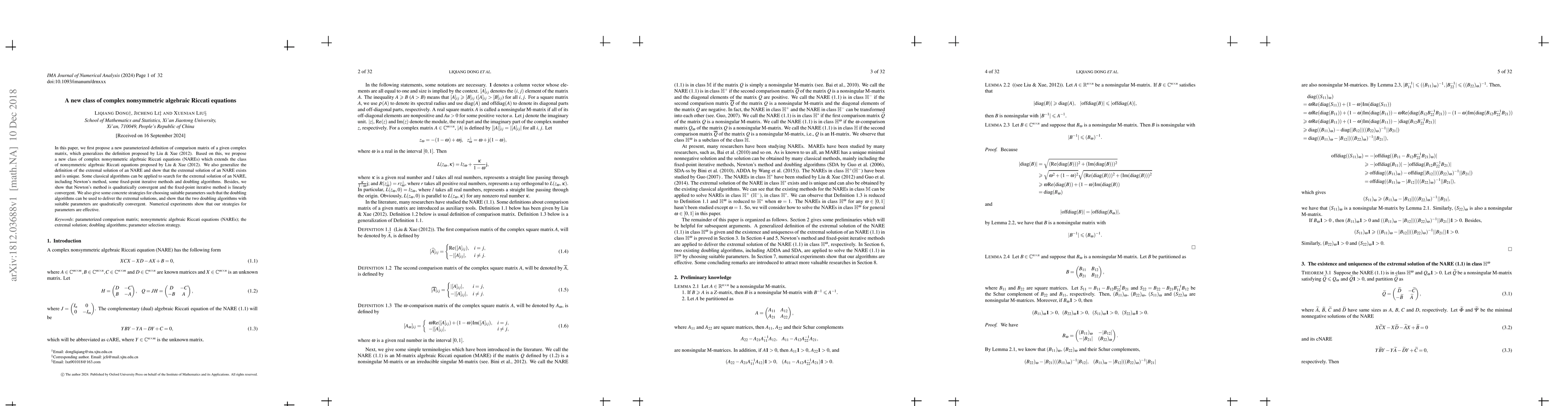 This paper introduces a new parameterized comparison matrix for complex matrices and proposes a new class of complex nonsymmetric algebraic Riccati equations (NAREs). It establishes the existence and uniqueness of the extremal solution for NAREs and demonstrates the convergence of classical algorithms like Newton's method and fixed-point iterative methods.