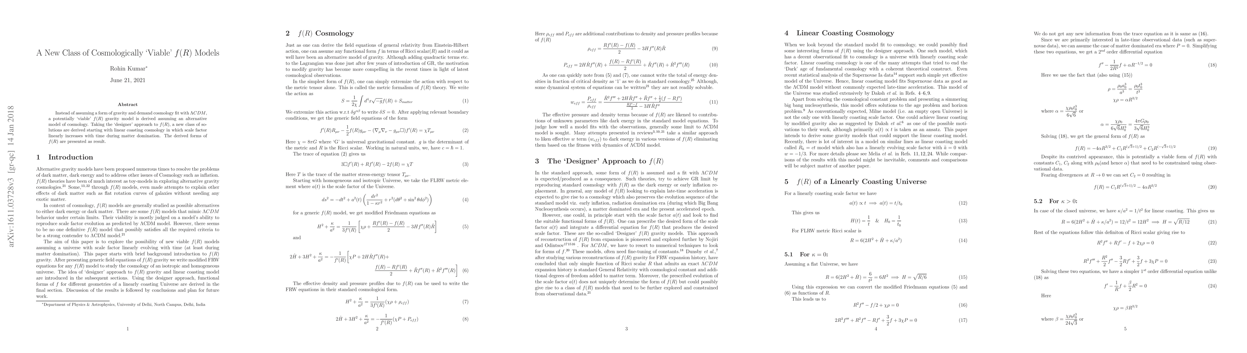 Instead of assuming a form of gravity and demand cosmology fit with $\Lambda CDM$, a potentially `viable' $f(R)$ gravity model is derived assuming an alternative model of cosmology. Taking the `designer' approach to $f(R)$, a new class of solutions are derived starting with linear coasting cosmology in which scale factor linearly increases with time during matter domination. The derived forms of $f(R)$ are presented as result.
