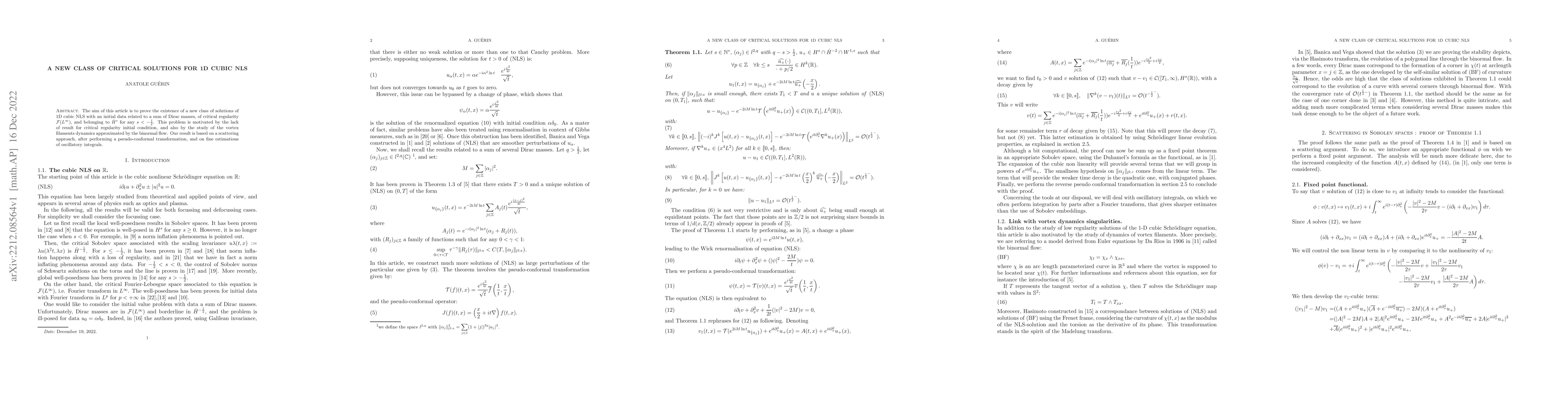 This paper establishes the existence of a new class of critical solutions for the 1D cubic nonlinear Schrödinger equation (NLS) with initial data composed of a sum of Dirac masses, characterized by critical regularity $F(L^\infty)$ and belonging to $\dot H^s$ for any $s < -1/2$. The study employs a scattering approach, pseudo-conformal transformation, and fine estimations of oscillatory integrals to achieve the result.