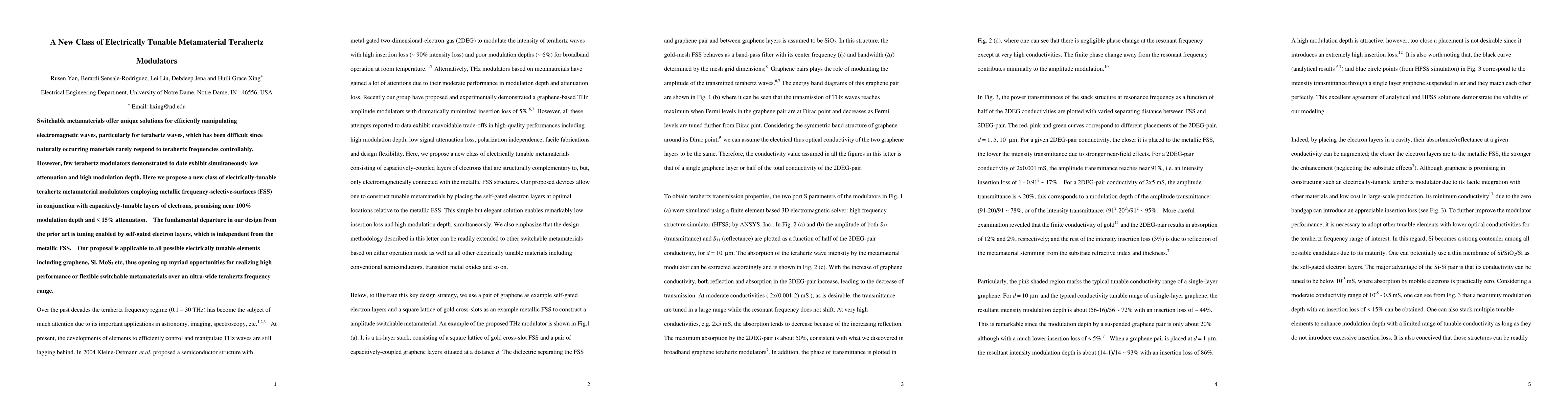 This research introduces a new type of electrically tunable terahertz metamaterial modulator using metallic frequency-selective surfaces and self-gated electron layers, achieving near 100% modulation depth with low attenuation, and applicable to various materials like graphene and silicon.