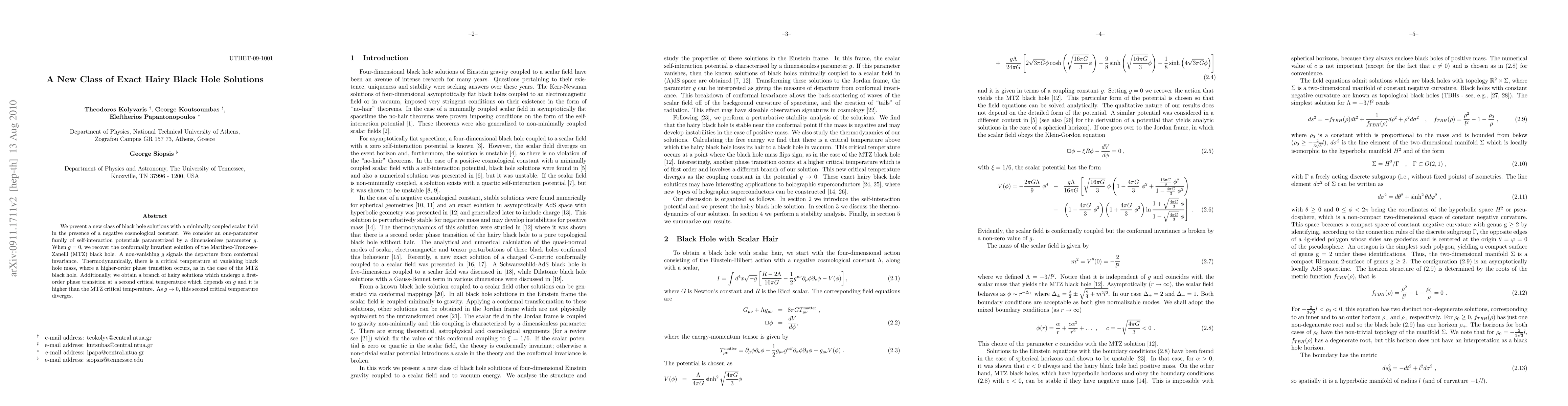 Researchers discovered a new class of hairy black hole solutions with a minimally coupled scalar field and negative cosmological constant, which exhibit stable and unstable behavior depending on mass and the dimensionless parameter $g$.