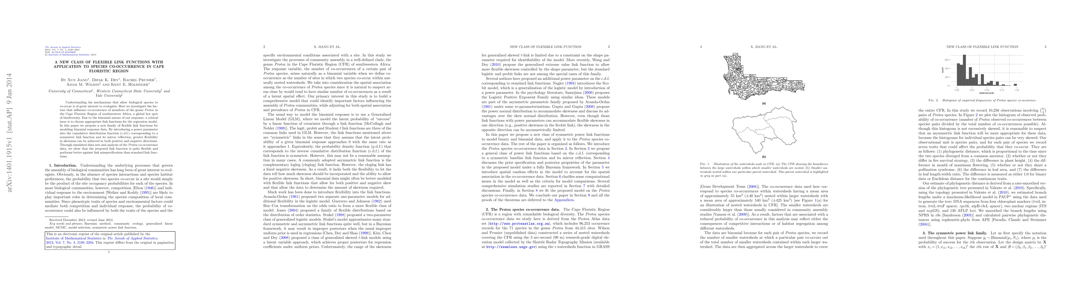 Understanding the mechanisms that allow biological species to co-occur is of great interest to ecologists. Here we investigate the factors that influence co-occurrence of members of the genus Protea in the Cape Floristic Region of southwestern Africa, a global hot spot of biodiversity. Due to the binomial nature of our response, a critical issue is to choose appropriate link functions for the regression model. In this paper we propose a new family of flexible link functions for modeling binomial response data. By introducing a power parameter into the cumulative distribution function (c.d.f.) corresponding to a symmetric link function and its mirror reflection, greater flexibility in skewness can be achieved in both positive and negative directions. Through simulated data sets and analysis of the Protea co-occurrence data, we show that the proposed link function is quite flexible and performs better against link misspecification than standard link functions.