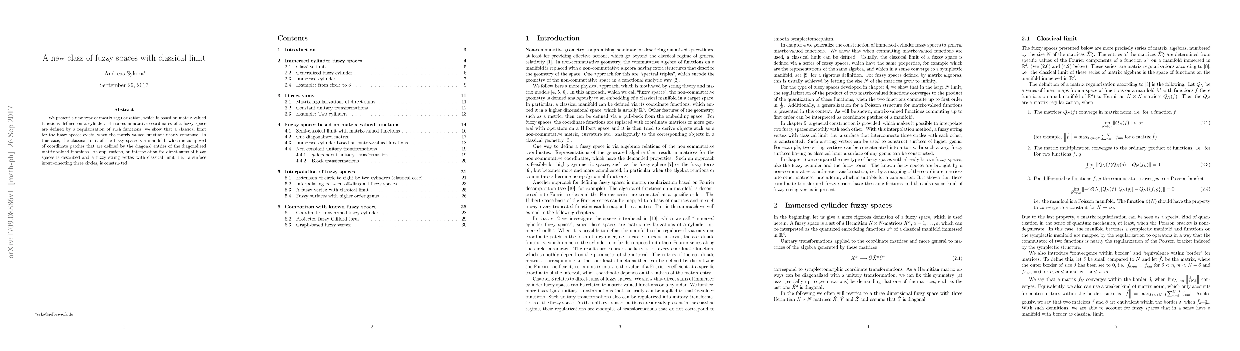 We present a new type of matrix regularization, which is based on matrix-valued functions defined on a cylinder. If non-commutative coordinates of a fuzzy space are defined by a regularization of such functions, we show that a classical limit for the fuzzy spaces exists, when the matrix-valued functions nearly commute. In this case, the classical limit of the fuzzy space is a manifold, which is composed of coordinate patches that are defined by the diagonal entries of the diagonalized matrix-valued functions. As applications, an interpolation for direct sums of fuzzy spaces is described and a fuzzy string vertex with classical limit, i.e. a surface interconnecting three circles, is constructed.