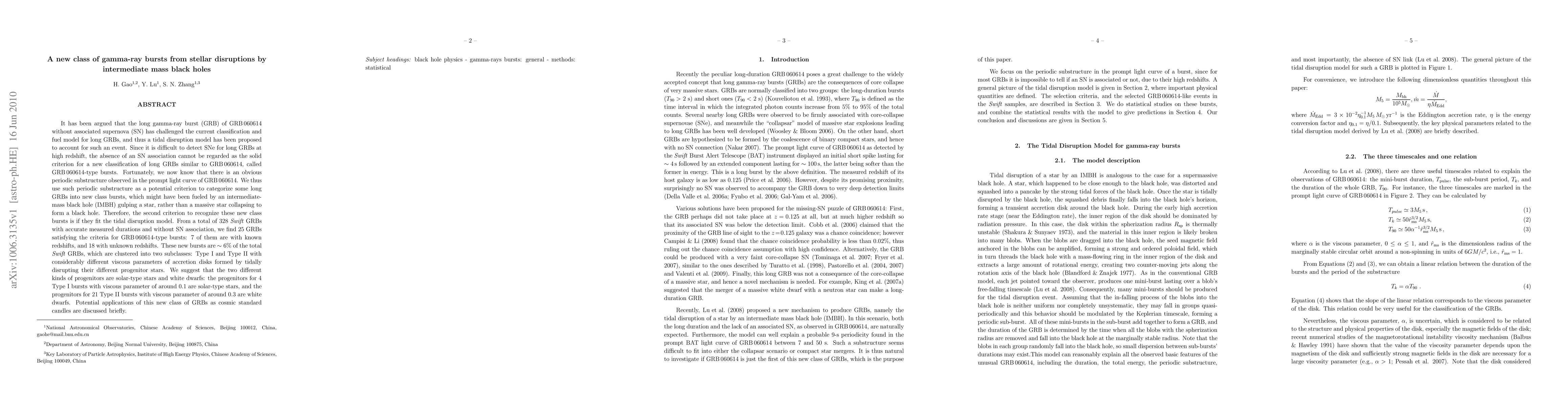 It has been argued that the long gamma-ray burst (GRB) of GRB 060614 without an associated supernova (SN) has challenged the current classification and fuel model for long GRBs, and thus a tidal disruption model has been proposed to account for such an event. Since it is difficult to detect SNe for long GRBs at high redshift, the absence of an SN association cannot be regarded as the solid criterion for a new classification of long GRBs similar to GRB 060614, called GRB 060614-type bursts. Fortunately, we now know that there is an obvious periodic substructure observed in the prompt light curve of GRB 060614. We thus use such periodic substructure as a potential criterion to categorize some long GRBs into a new class of bursts, which might have been fueled by an intermediate-mass black hole (IMBH) gulping a star, rather than a massive star collapsing to form a black hole. Therefore, the second criterion to recognize for this new class of bursts is whether they fit the tidal disruption model. From a total of 328 Swift GRBs with accurately measured durations and without SN association, we find 25 GRBs satisfying the criteria for GRB 060614-type bursts: seven of them are with known redshifts and 18 with unknown redshifts. These new bursts are ~6% of the total Swift GRBs, which are clustered into two subclasses: Type I and Type II with considerably different viscous parameters of accretion disks formed by tidally disrupting their different progenitor stars. We suggest that the two different kinds of progenitors are solar-type stars and white dwarfs: the progenitors for four Type I bursts with viscous parameter of around 0.1 are solar-type stars, and the progenitors for 21 Type II bursts with viscous parameter of around 0.3 are white dwarfs. The potential applications of this new class of GRBs as cosmic standard candles are discussed briefly