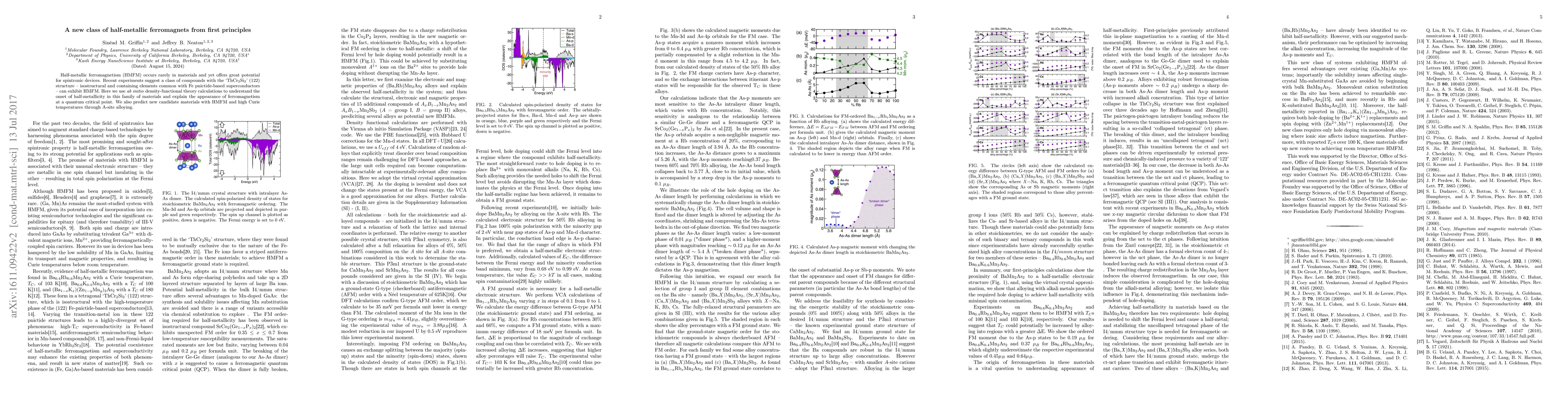 Half-metallic ferromagnetism (HMFM) occurs rarely in materials and yet offers great potential for spintronic devices. Recent experiments suggest a class of compounds with the `ThCr$_{2}$Si$_{2}$' (122) structure -- isostructural and containing elements common with Fe pnictide-based superconductors -- can exhibit HMFM. Here we use $ab$ $initio$ density-functional theory calculations to understand the onset of half-metallicity in this family of materials and explain the appearance of ferromagnetism at a quantum critical point. We also predict new candidate materials with HMFM and high Curie temperatures through A-site alloying.
