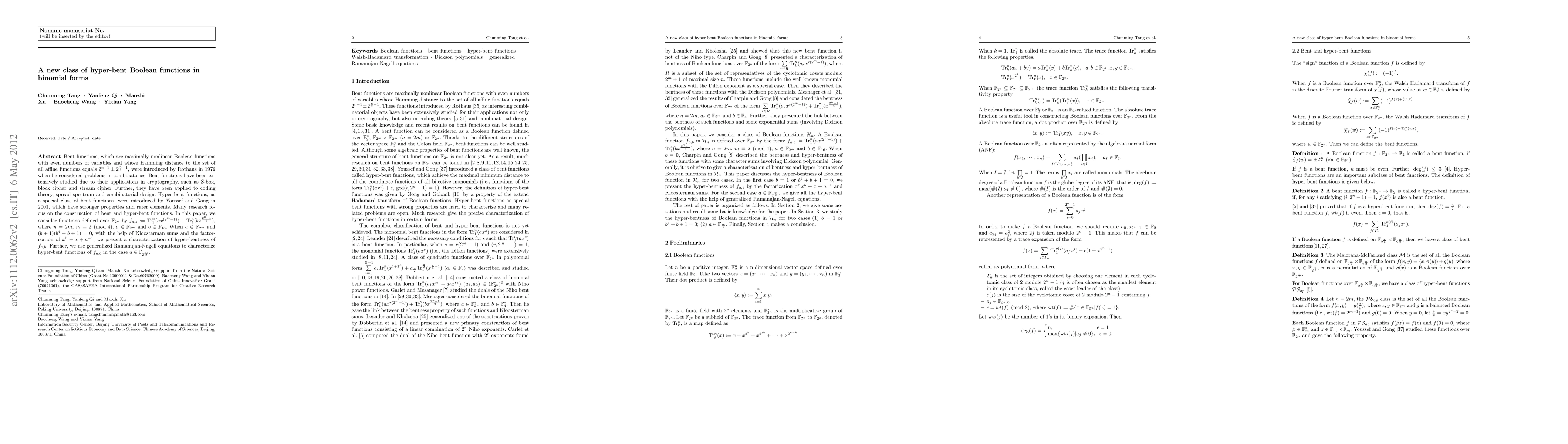 This paper introduces a new class of hyper-bent Boolean functions in binomial forms, characterized using Kloosterman sums and generalized Ramanujan-Nagell equations. The functions are defined over $\mathbb{F}_{2^n}$ and exhibit stronger properties than standard bent functions, with potential applications in cryptography and coding theory.