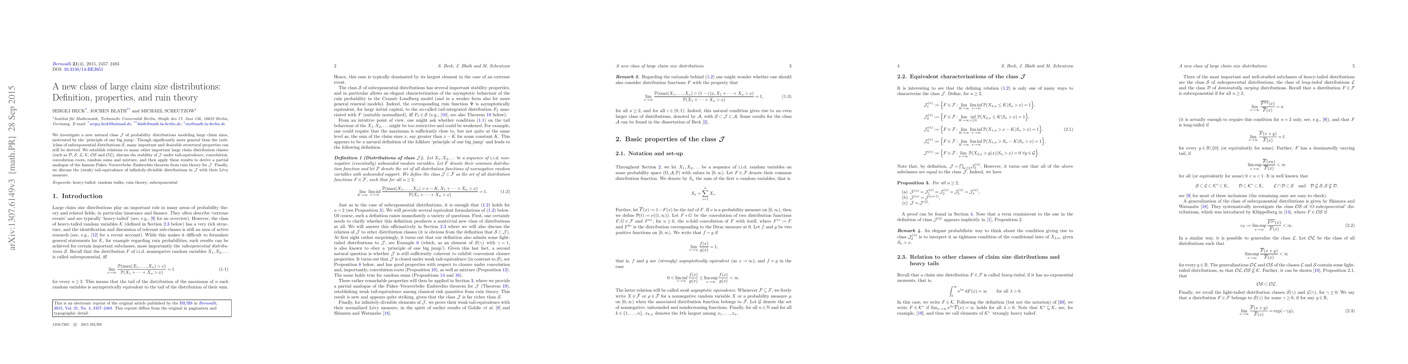 We investigate a new natural class $\mathcal{J}$ of probability distributions modeling large claim sizes, motivated by the `principle of one big jump'. Though significantly more general than the (sub-)class of subexponential distributions $\mathcal{S}$, many important and desirable structural properties can still be derived. We establish relations to many other important large claim distribution classes (such as $\mathcal{D}$, $\mathcal{S}$, $\mathcal{L}$, $\mathcal {K}$, $\mathcal{OS}$ and $\mathcal{OL}$), discuss the stability of $\mathcal{J}$ under tail-equivalence, convolution, convolution roots, random sums and mixture, and then apply these results to derive a partial analogue of the famous Pakes-Veraverbeke-Embrechts theorem from ruin theory for $\mathcal{J}$. Finally, we discuss the (weak) tail-equivalence of infinitely-divisible distributions in $\mathcal{J}$ with their L\'{e}vy measure.