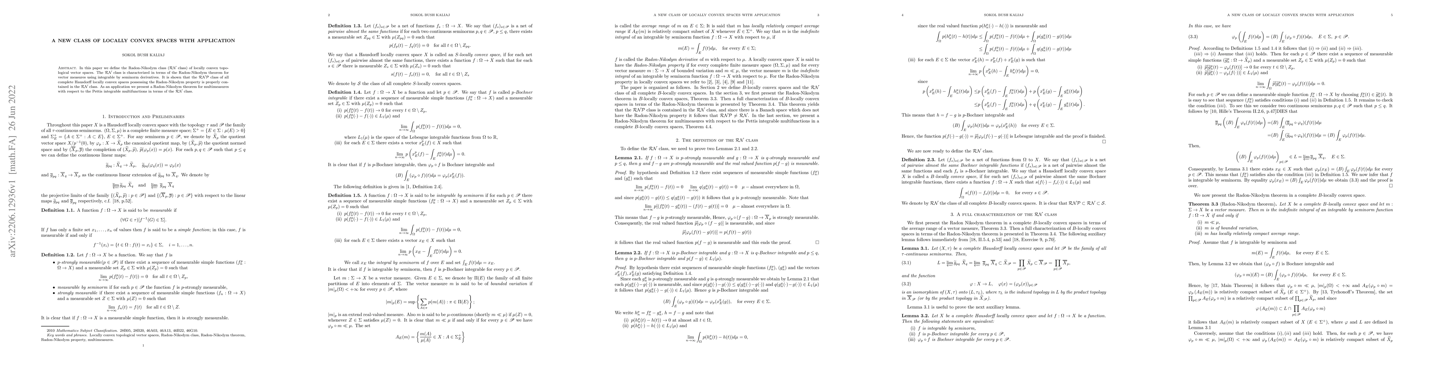 In this paper we define the Radon-Nikodym class (RN class) of locally convex topological vector spaces. The RN class is characterized in terms of the Radon-Nikodym theorem for vector measures using integrable by seminorm derivatives. It is shown that the RNP class of all complete Hausdorff locally convex spaces possessing the Radon-Nikodym property is properly contained in the RN class. As an application we present a Radon-Nikodym theorem for multimeasures with respect to the Pettis integrable multifunctions in terms of the RN class.