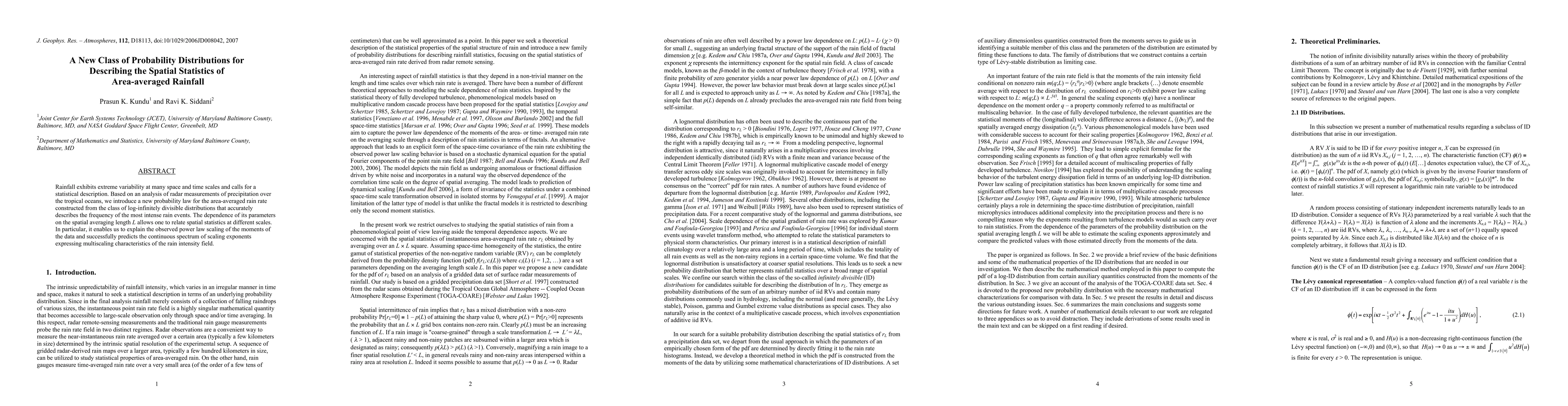 This paper introduces a new probability distribution based on log-infinitely divisible distributions to describe the spatial statistics of area-averaged rainfall, accurately capturing intense rain events. The model's parameter dependence on spatial averaging length explains power law scaling and predicts multiscaling characteristics of rain intensity.