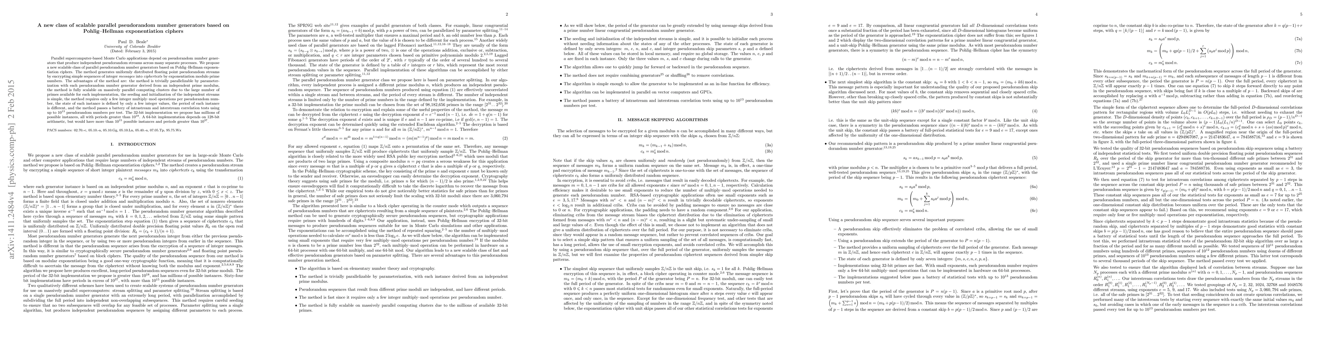 This paper introduces a scalable parallel pseudorandom number generator based on Pohlig-Hellman exponentiation ciphers, which efficiently produces independent pseudorandom streams for supercomputer applications. The method is parallelizable, scalable, and passes extensive correlation tests with high periods and minimal computational operations.