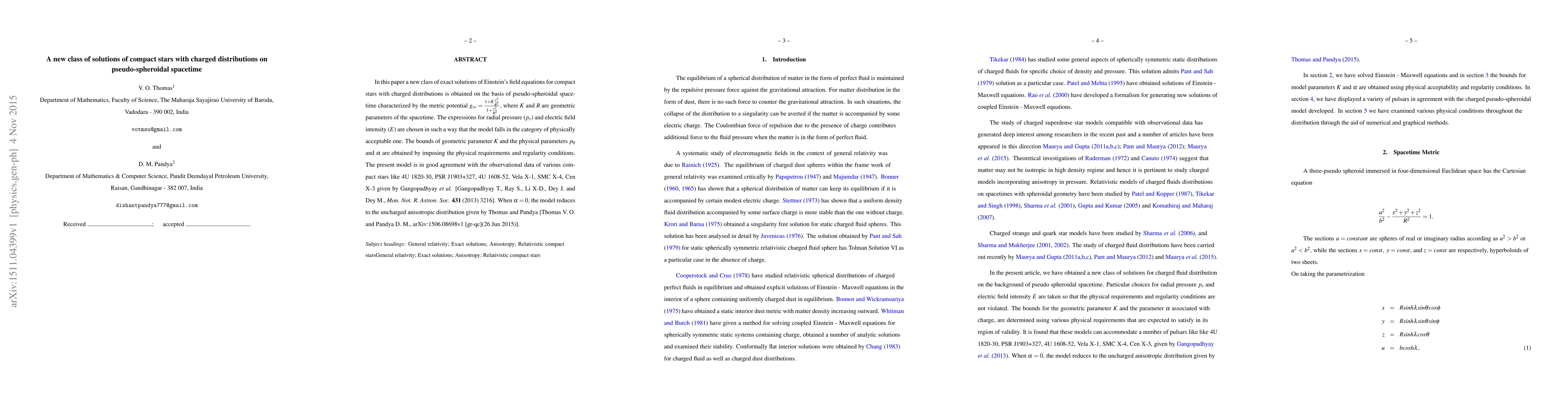 In this paper a new class of exact solutions of Einstein's field equations for compact stars with charged distributions is obtained on the basis of pseudo-spheroidal spacetime characterized by the metric potential $g_{rr}=\frac{1+K\frac{r^{2}}{R^{2}}}{1+\frac{r^{2}}{R^{2}}}$, where $K$ and $R$ are geometric parameters of the spacetime. The expressions for radial pressure ($ p_r $) and electric field intensity ($ E $) are chosen in such a way that the model falls in the category of physically acceptable one. The bounds of geometric parameter $K$ and the physical parameters $ p_0 $ and $\alpha$ are obtained by imposing the physical requirements and regularity conditions. The present model is in good agreement with the observational data of various compact stars like 4U 1820-30, PSR J1903+327, 4U 1608-52, Vela X-1, SMC X-4, Cen X-3 given by Gangopadhyay {\em{et al.}} [Gangopadhyay T., Ray S., Li X-D., Dey J. and Dey M., {\it Mon. Not. R. Astron. Soc.} {\bf431} (2013) 3216]. When $ \alpha = 0, $ the model reduces to the uncharged anisotropic distribution given by Thomas and Pandya [Thomas V. O. and Pandya D. M.,~arXiv:1506.08698v1 [gr-qc](26 Jun 2015)].