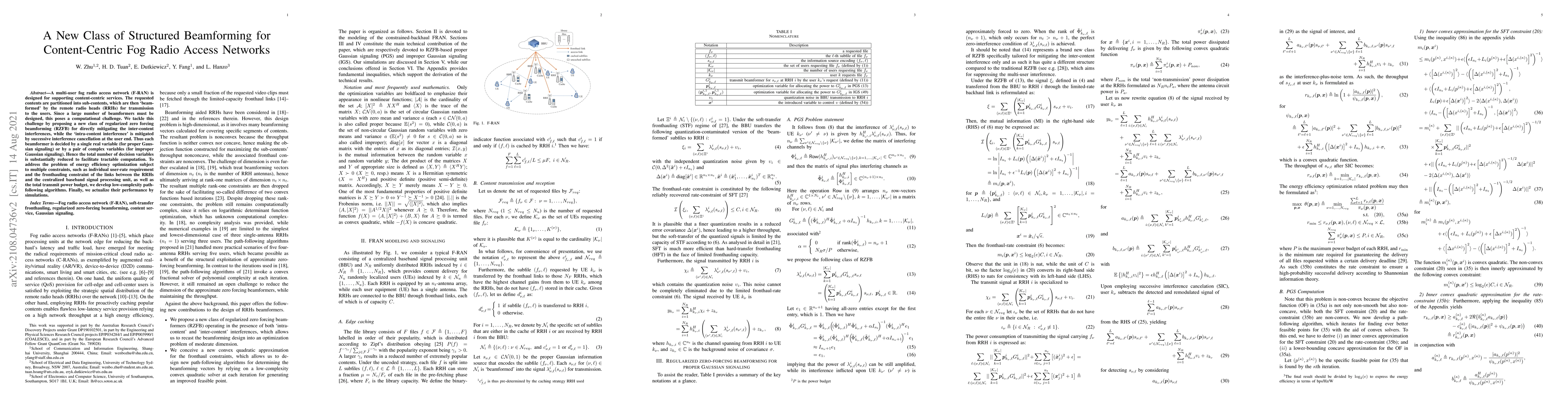 A multi-user fog radio access network (F-RAN) is designed for supporting content-centric services. The requested contents are partitioned into sub-contents, which are then 'beam- formed' by the remote radio heads (RRHs) for transmission to the users. Since a large number of beamformers must be designed, this poses a computational challenge. We tackle this challenge by proposing a new class of regularized zero forcing beamforming (RZFB) for directly mitigating the inter-content interferences, while the 'intra-content interference' is mitigated by successive interference cancellation at the user end. Thus each beamformer is decided by a single real variable (for proper Gaus- sian signaling) or by a pair of complex variables (for improper Gaussian signaling). Hence the total number of decision variables is substantially reduced to facilitate tractable computation. To address the problem of energy efficiency optimization subject to multiple constraints, such as individual user-rate requirement and the fronthauling constraint of the links between the RRHs and the centralized baseband signal processing unit, as well as the total transmit power budget, we develop low-complexity path- following algorithms. Finally, we actualize their performance by simulations.
