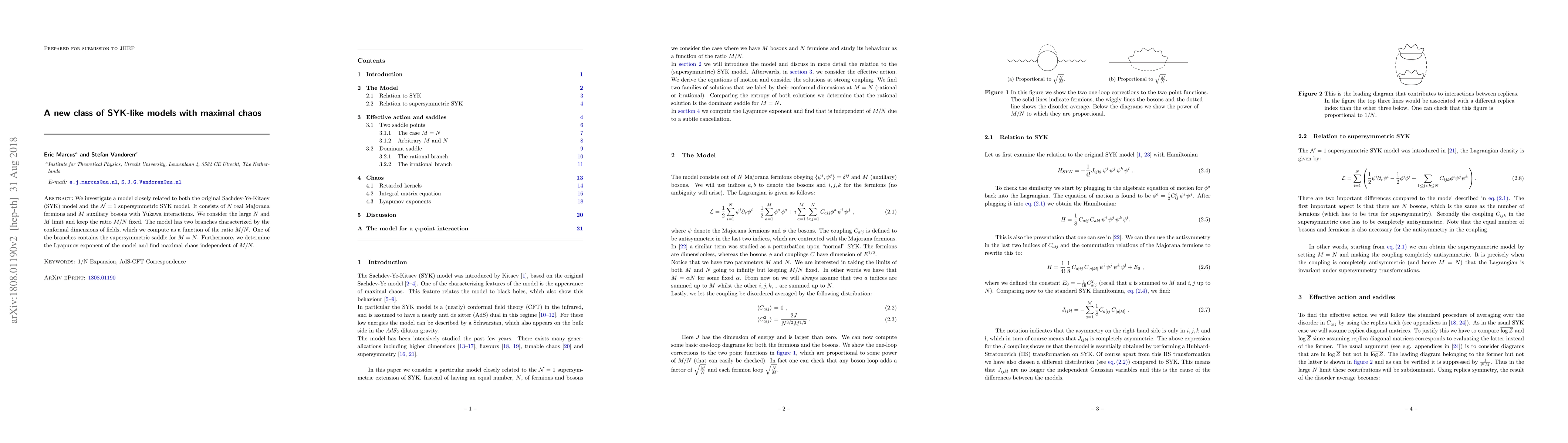 We investigate a model closely related to both the original Sachdev-Ye-Kitaev (SYK) model and the $\mathcal{N}=1$ supersymmetric SYK model. It consists of $N$ real Majorana fermions and $M$ auxiliary bosons with Yukawa interactions. We consider the large $N$ and $M$ limit and keep the ratio $M/N$ fixed. The model has two branches characterized by the conformal dimensions of fields, which we compute as a function of the ratio $M/N$. One of the branches contains the supersymmetric saddle for $M=N$. Furthermore, we determine the Lyapunov exponent of the model and find maximal chaos independent of $M/N$.