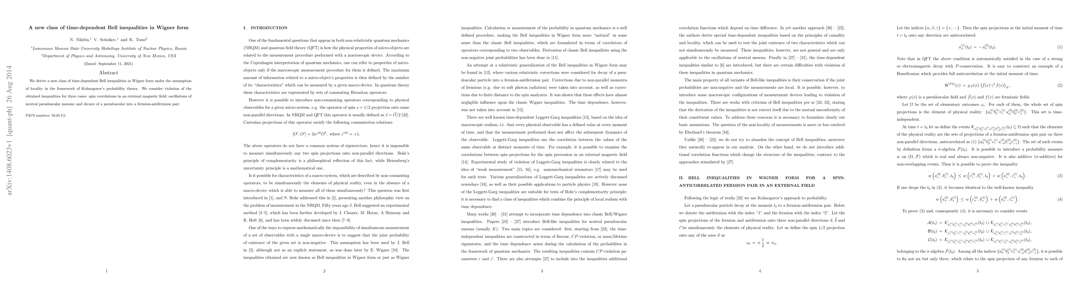 We derive a new class of time-dependent Bell inequalities in Wigner form under the assumption of locality in the framework of Kolmogorov's probability theory. We consider violation of the obtained inequalities for three cases: spin correlations in an external magnetic field; oscillations of neutral pseudoscalar mesons; and decays of a pseudoscalar into a fermion-antifermion pair.