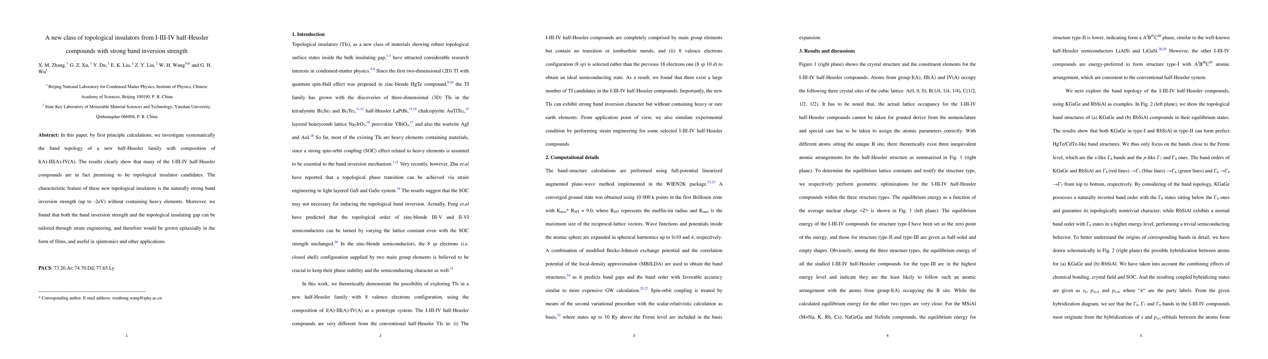 This paper identifies a new class of topological insulators based on I-III-IV half-Heusler compounds, demonstrating strong band inversion without heavy elements. The study reveals that these materials' topological properties can be engineered via strain, making them viable for spintronics applications.