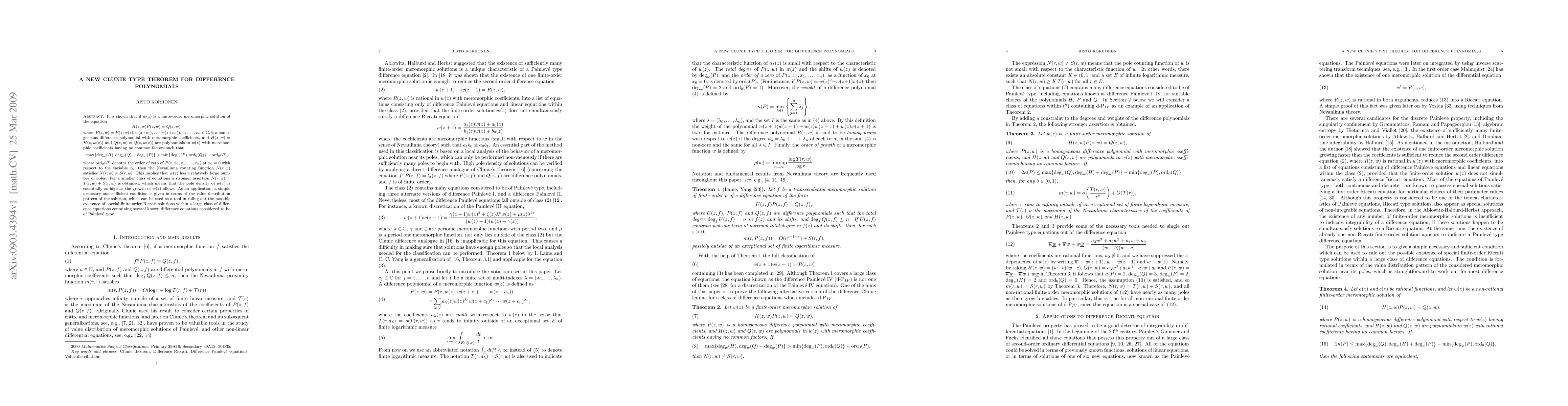 It is shown that if w(z) is a finite-order meromorphic solution of the equation H(z,w) P(z,w) = Q(z,w), where P(z,w) = P(z,w(z),w(z+c_1),...,w(z+c_n)) is a homogeneous difference polynomial with meromorphic coefficients, and H(z,w) = H(z,w(z)) and Q(z,w) = Q(z,w(z)) are polynomials in w(z) with meromorphic coefficients having no common factors such that max{deg_w(H), deg_w(Q) - deg_w(P)} > min{deg_w(P), ord_0(Q)} - ord_0(P), where ord_0(P) denotes the order of zero of P(z,x_0,x_1,...,x_n) at x_0=0 with respect to the variable x_0, then the Nevanlinna counting function N(r,w) satisfies N(r,w) > S(r,w). This implies that w(z) has a relatively large number of poles. For a smaller class of equations a stronger assertion N(r,w) = T(r,w)+S(r,w) is obtained, which means that the pole density of w(z) is essentially as high as the growth of w(z) allows. As an application, a simple necessary and sufficient condition is given in terms of the value distribution pattern of the solution, which can be used as a tool in ruling out the possible existence of special finite-order Riccati solutions within a large class of difference equations containing several known difference equations considered to be of Painleve type.