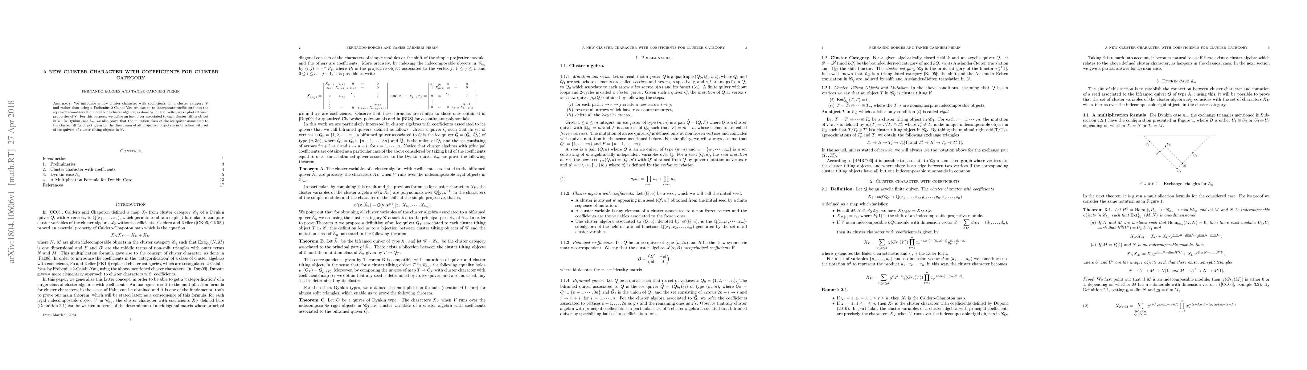 We introduce a new cluster character with coefficients for a cluster category $\mathcal{C}$ and rather than using a Frobenius $2$-Calabi-Yau realization to incorporate coefficients into the representation-theoretic model for a cluster algebra, as done by Fu and Keller, we exploit intrinsic properties of $\mathcal{C}$. For this purpose, we define an ice quiver associated to each cluster tilting object in $\mathcal{C}$. In Dynkin case $\mathbb{A}_n$, we also prove that the mutation class of the ice quiver associated to the cluster tilting object given by the direct sum of all projective objects is in bijection with set of ice quivers of cluster tilting objects in $\mathcal{C}$.