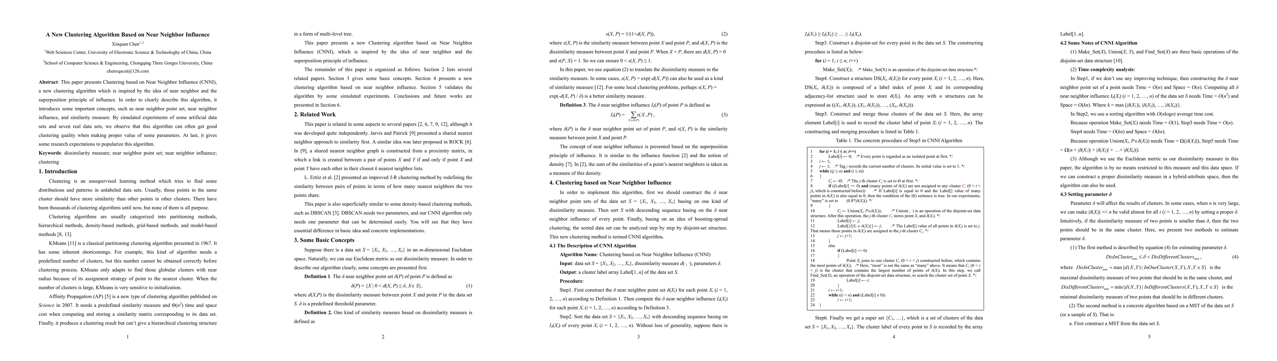 This paper introduces Clustering based on Near Neighbor Influence (CNNI), a novel algorithm leveraging near neighbor influence and superposition principles. Experimental results on both artificial and real datasets show that CNNI often achieves good clustering quality with appropriate parameter settings.