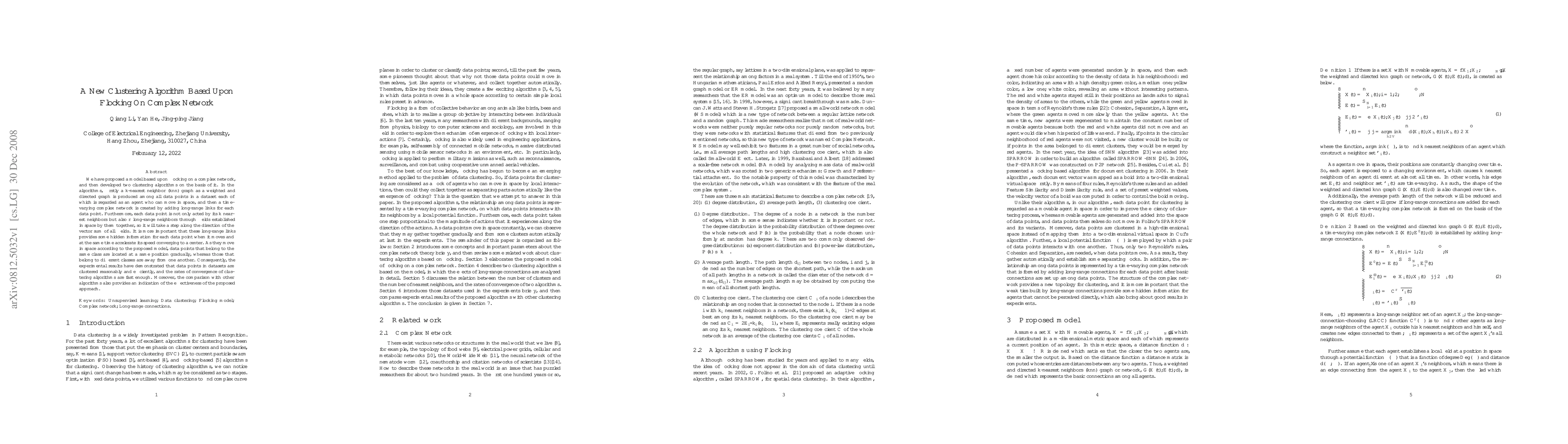 We have proposed a model based upon flocking on a complex network, and then developed two clustering algorithms on the basis of it. In the algorithms, firstly a \textit{k}-nearest neighbor (knn) graph as a weighted and directed graph is produced among all data points in a dataset each of which is regarded as an agent who can move in space, and then a time-varying complex network is created by adding long-range links for each data point. Furthermore, each data point is not only acted by its \textit{k} nearest neighbors but also \textit{r} long-range neighbors through fields established in space by them together, so it will take a step along the direction of the vector sum of all fields. It is more important that these long-range links provides some hidden information for each data point when it moves and at the same time accelerate its speed converging to a center. As they move in space according to the proposed model, data points that belong to the same class are located at a same position gradually, whereas those that belong to different classes are away from one another. Consequently, the experimental results have demonstrated that data points in datasets are clustered reasonably and efficiently, and the rates of convergence of clustering algorithms are fast enough. Moreover, the comparison with other algorithms also provides an indication of the effectiveness of the proposed approach.