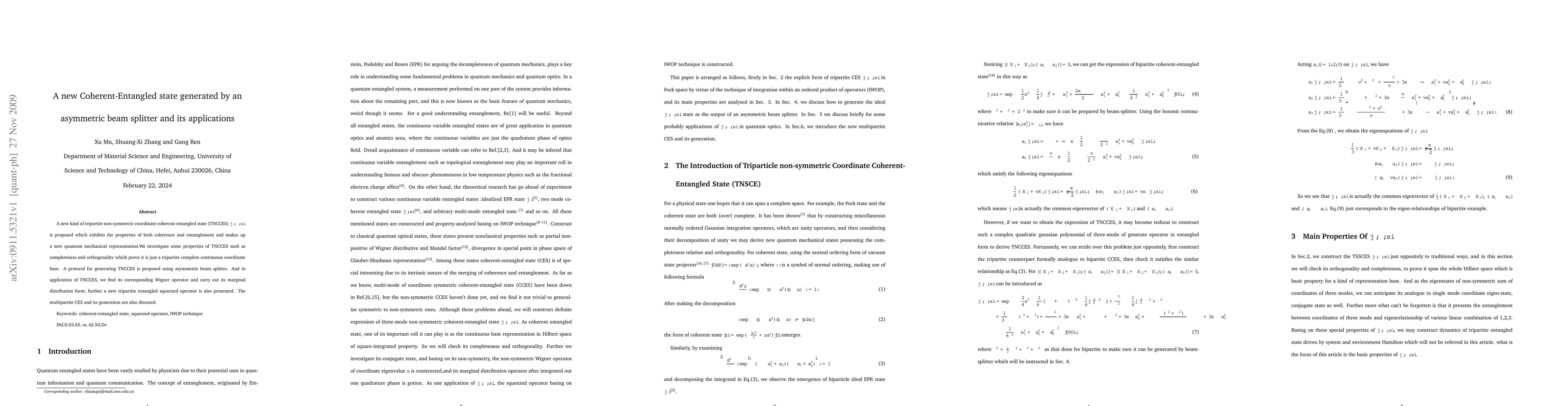 This paper proposes a new tripartite non-symmetric coordinate coherent-entangled state (TNCCES) generated via an asymmetric beam splitter, exploring its properties and completeness. It also discusses applications including the Wigner operator and a new tripartite entangled squeezed operator.