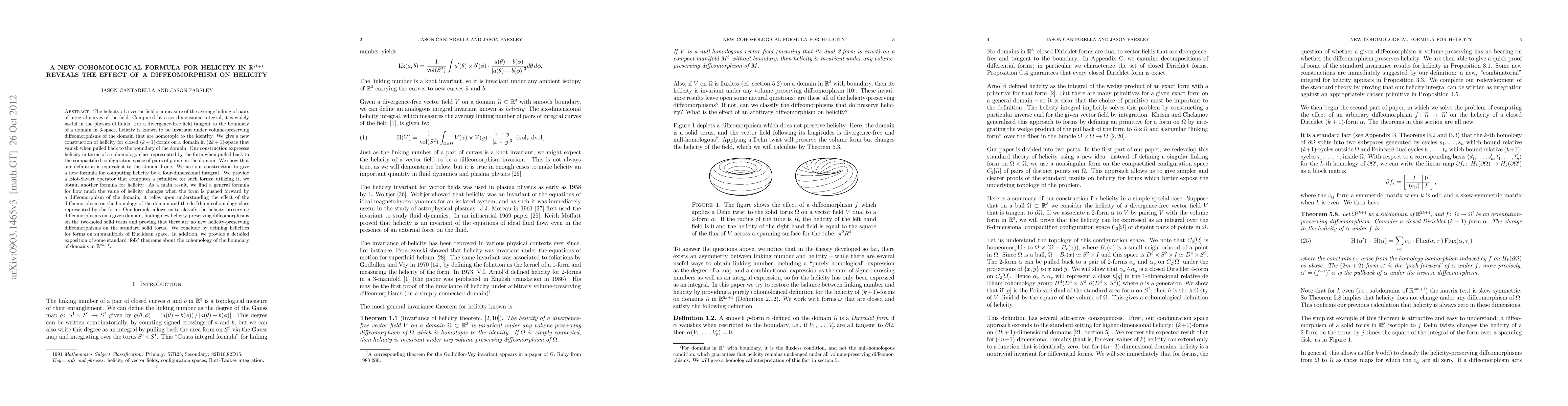 The helicity of a vector field is a measure of the average linking of pairs of integral curves of the field. Computed by a six-dimensional integral, it is widely useful in the physics of fluids. For a divergence-free field tangent to the boundary of a domain in 3-space, helicity is known to be invariant under volume-preserving diffeomorphisms of the domain that are homotopic to the identity. We give a new construction of helicity for closed $(k+1)$-forms on a domain in $(2k+1)$-space that vanish when pulled back to the boundary of the domain. Our construction expresses helicity in terms of a cohomology class represented by the form when pulled back to the compactified configuration space of pairs of points in the domain. We show that our definition is equivalent to the standard one. We use our construction to give a new formula for computing helicity by a four-dimensional integral. We provide a Biot-Savart operator that computes a primitive for such forms; utilizing it, we obtain another formula for helicity. As a main result, we find a general formula for how much the value of helicity changes when the form is pushed forward by a diffeomorphism of the domain; it relies upon understanding the effect of the diffeomorphism on the homology of the domain and the de Rham cohomology class represented by the form. Our formula allows us to classify the helicity-preserving diffeomorphisms on a given domain, finding new helicity-preserving diffeomorphisms on the two-holed solid torus, and proving that there are no new helicity-preserving diffeomorphisms on the standard solid torus. We conclude by defining helicities for forms on submanifolds of Euclidean space. In addition, we provide a detailed exposition of some standard `folk' theorems about the cohomology of the boundary of domains in $\R^{2k+1}$.
