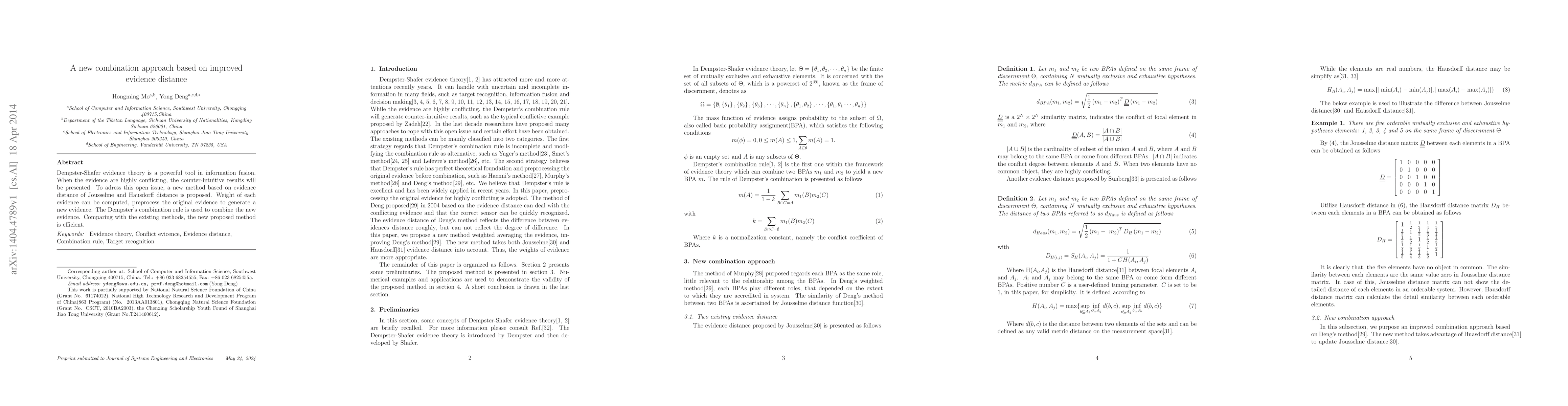 Dempster-Shafer evidence theory is a powerful tool in information fusion. When the evidence are highly conflicting, the counter-intuitive results will be presented. To adress this open issue, a new method based on evidence distance of Jousselme and Hausdorff distance is proposed. Weight of each evidence can be computed, preprocess the original evidence to generate a new evidence. The Dempster's combination rule is used to combine the new evidence. Comparing with the existing methods, the new proposed method is efficient.