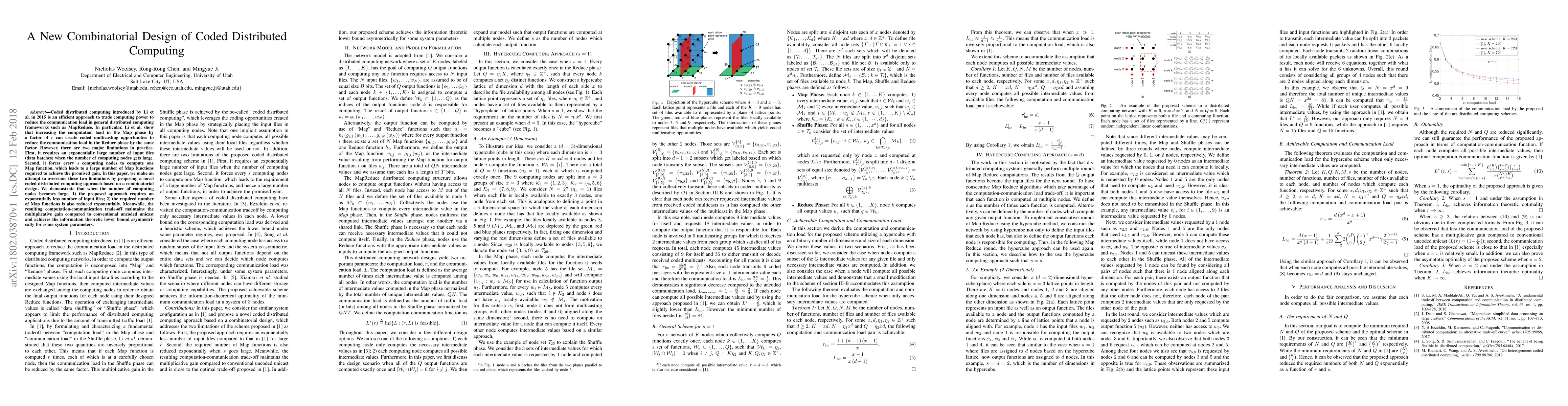 This paper proposes a new combinatorial design for coded distributed computing to address the limitations of previous methods, specifically reducing the need for a large number of input files and Map functions while maintaining a multiplicative computation-communication trade-off and achieving information theoretic lower bounds for certain parameters.