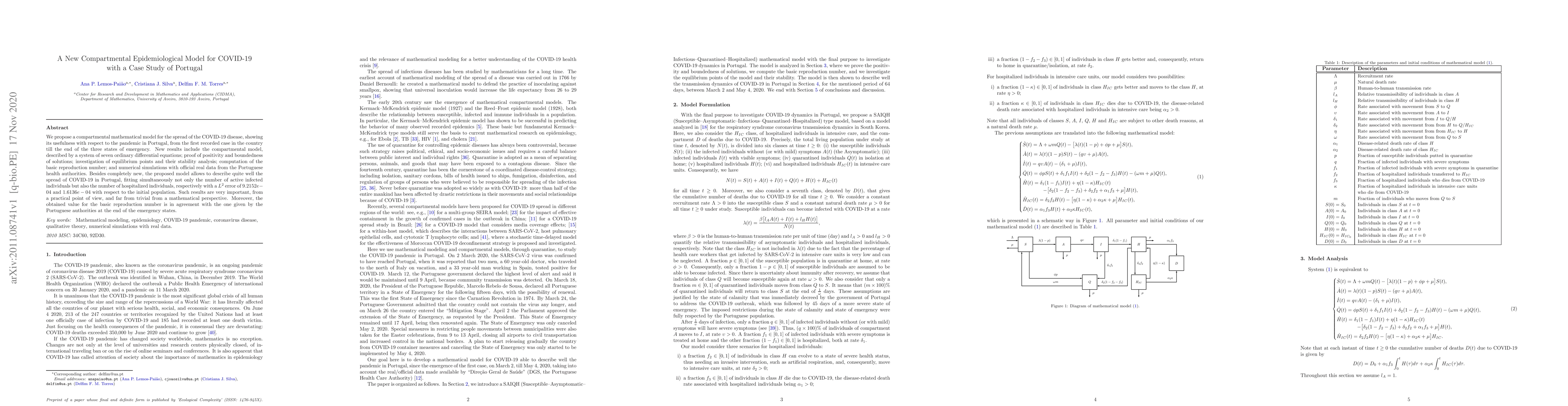 We propose a compartmental mathematical model for the spread of the COVID-19 disease, showing its usefulness with respect to the pandemic in Portugal, from the first recorded case in the country till the end of the three states of emergency. New results include the compartmental model, described by a system of seven ordinary differential equations; proof of positivity and boundedness of solutions; investigation of equilibrium points and their stability analysis; computation of the basic reproduction number; and numerical simulations with official real data from the Portuguese health authorities. Besides completely new, the proposed model allows to describe quite well the spread of COVID-19 in Portugal, fitting simultaneously not only the number of active infected individuals but also the number of hospitalized individuals, respectively with a $L^2$ error of $9.2152e-04$ and $1.6136e-04$ with respect to the initial population. Such results are very important, from a practical point of view, and far from trivial from a mathematical perspective. Moreover, the obtained value for the basic reproduction number is in agreement with the one given by the Portuguese authorities at the end of the emergency states.