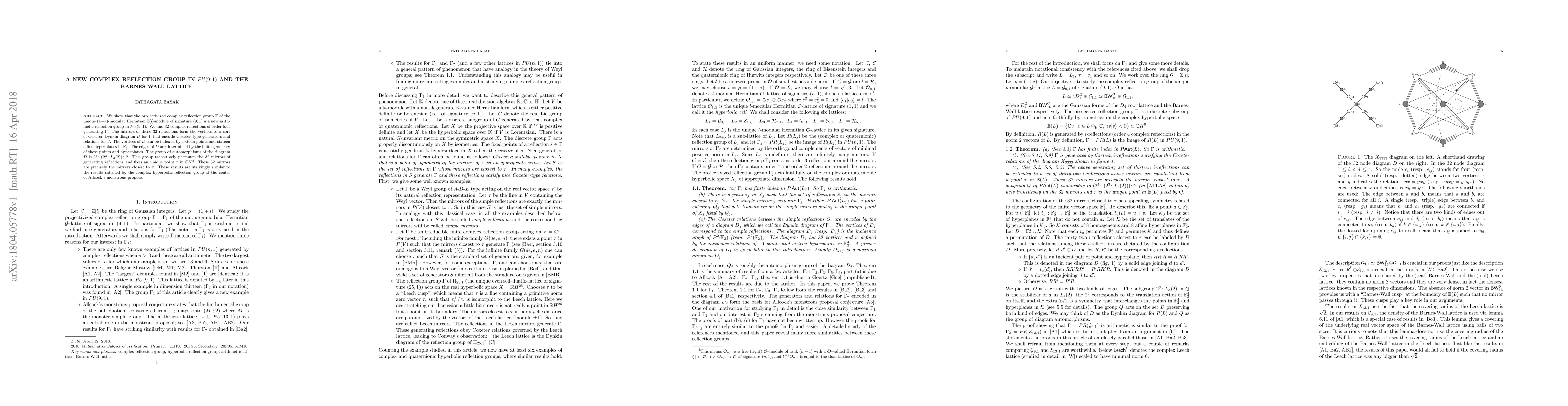 We show that the projectivized complex reflection group $\Gamma$ of the unique $(1+i)$-modular Hermitian $\mathbb{Z}[i]$-module of signature $(9,1)$ is a new arithmetic reflection group in $PU(9,1)$. We find $32$ complex reflections of order four generating $\Gamma$. The mirrors of these $32$ reflections form the vertices of a sort of Coxeter-Dynkin diagram $D$ for $\Gamma$ that encode Coxeter-type generators and relations for $\Gamma$. The vertices of $D$ can be indexed by sixteen points and sixteen affine hyperplanes in $\mathbb{F}_2^4$. The edges of $D$ are determined by the finite geometry of these points and hyperplanes. The group of automorphisms of the diagram $D$ is $2^4 \colon (2^3 \colon L_3(2)) \colon 2$. This group transitively permutes the $32$ mirrors of generating reflections and fixes an unique point $\tau$ in $\mathbb{C} H^9$. These $32$ mirrors are precisely the mirrors closest to $\tau$. These results are strikingly similar to the results satisfied by the complex hyperbolic reflection group at the center of Allcock's monstrous proposal.