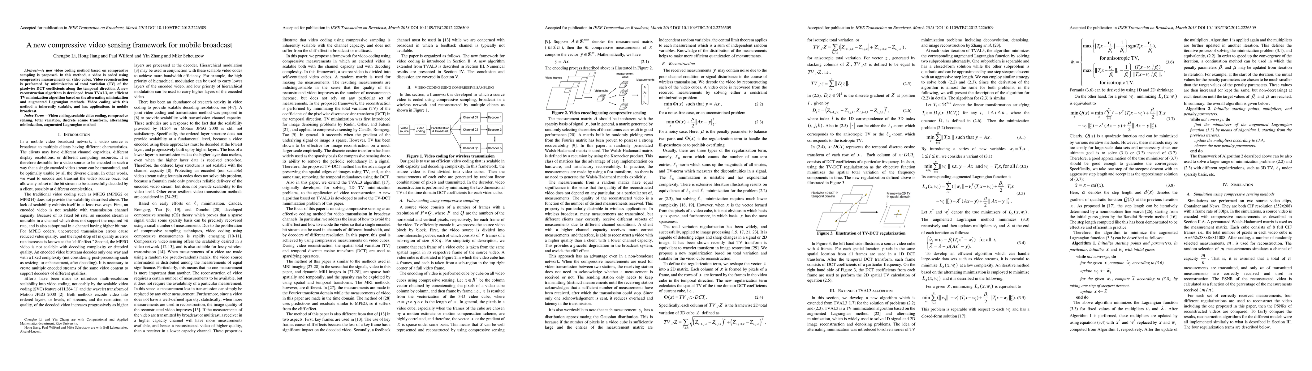 A new video coding method based on compressive sampling is proposed for mobile broadcast, utilizing TV minimization for reconstruction. The framework is inherently scalable and has potential applications in this field.