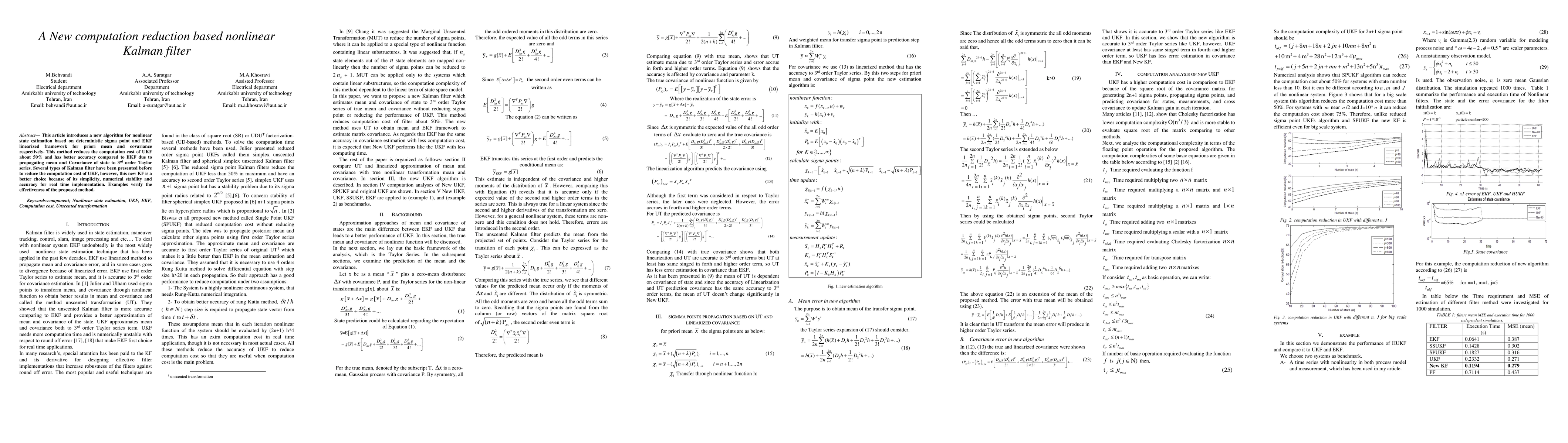 This paper proposes a new nonlinear Kalman filter algorithm that reduces computational cost by 50% compared to the Unscented Kalman Filter (UKF) while maintaining accuracy through a deterministic sigma point and EKF linearized framework. The method's simplicity, numerical stability, and improved accuracy make it a superior choice for real-time implementation.