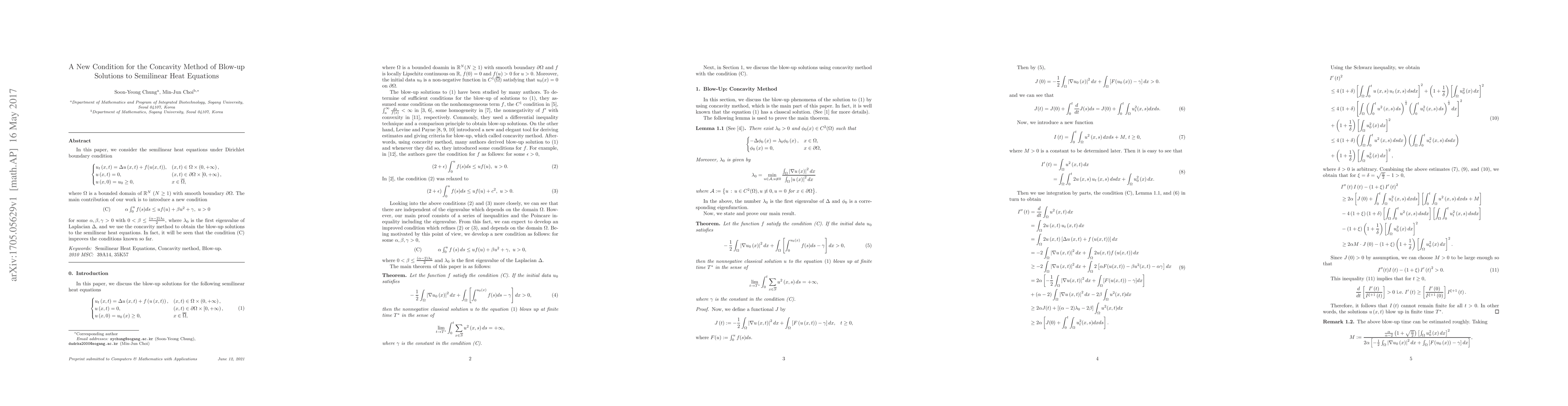 In this paper, we consider the semilinear heat equations under Dirichlet boundary condition \[ u_{t}\left(x,t\right)=\Delta u\left(x,t\right)+f(u(x,t)), & \left(x,t\right)\in \Omega\times\left(0,+\infty\right), u\left(x,t\right)=0, & \left(x,t\right)\in\partial \Omega\times\left[0,+\infty\right), u\left(x,0\right)=u_{0}\geq0, & x\in\overline{\Omega}, \] where $\Omega$ is a bounded domain of $\mathbb{R}^{N}$ $(N\geq1)$ with smooth boundary $\partial\Omega$. The main contribution of our work is to introduce a new condition \[ (C) \alpha \int_{0}^{u}f(s)ds \leq uf(u)+\beta u^{2}+\gamma,\,\,u>0 \] for some $\alpha, \beta, \gamma>0$ with $0<\beta\leq\frac{\left(\alpha-2\right)\lambda_{0}}{2}$, where $\lambda_{0}$ is the first eigenvalue of Laplacian $\Delta$, and we use the concavity method to obtain the blow-up solutions to the semilinear heat equations. In fact, it will be seen that the condition (C) improves the conditions known so far.