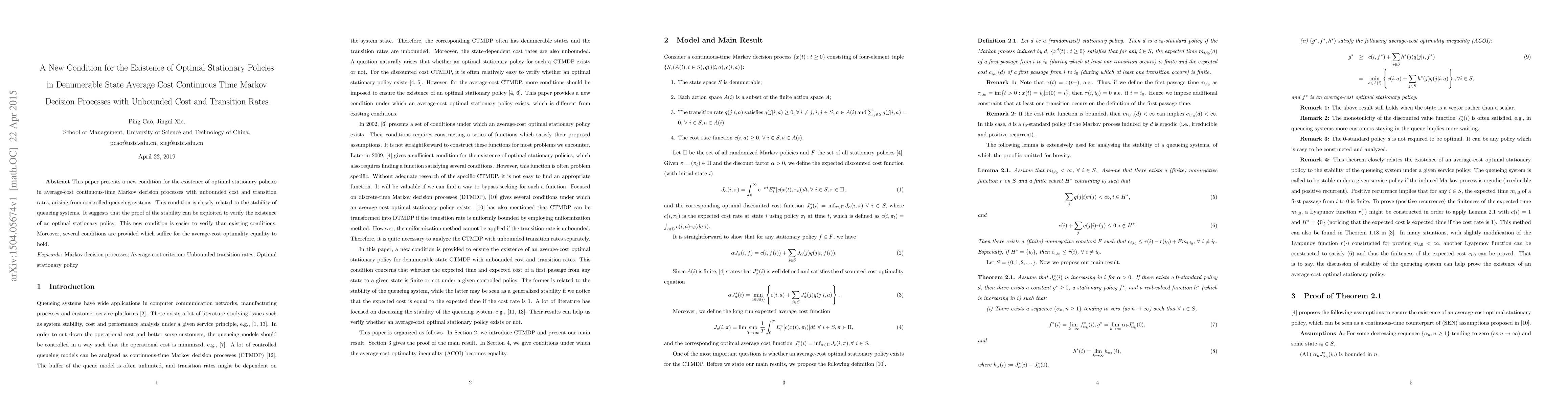 This paper introduces a new condition for the existence of optimal stationary policies in continuous-time Markov decision processes with unbounded costs and transition rates, linked to queueing system stability. It simplifies verification compared to existing conditions and provides sufficient conditions for average-cost optimality.