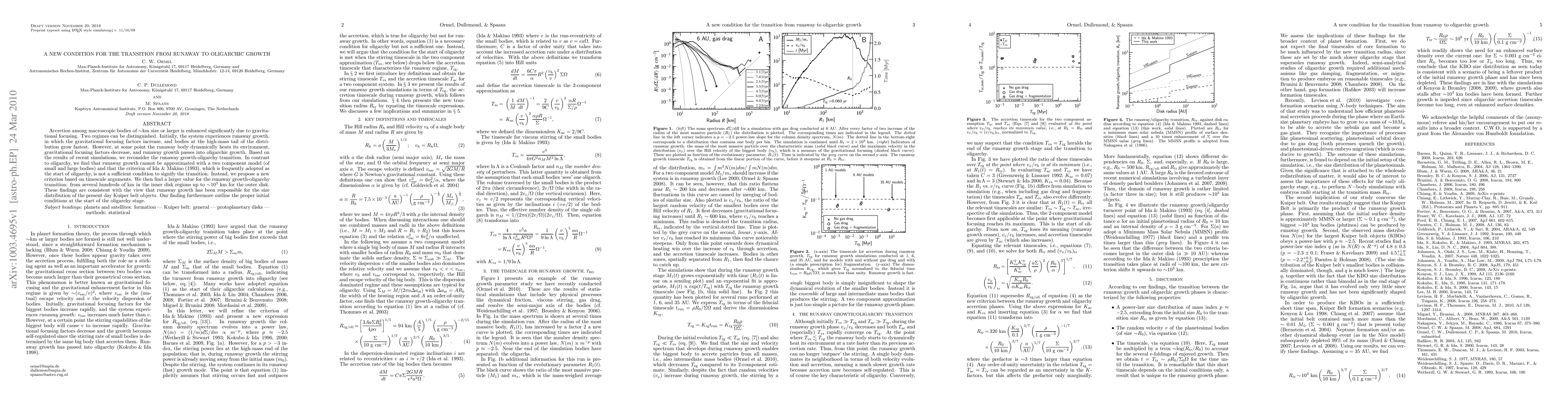This paper proposes a new criterion for the transition from runaway to oligarchic growth in accretion processes, finding that the previously used criterion is insufficient. It suggests a larger transition size range, from several hundred km to ~10^3 km, based on simulation results.