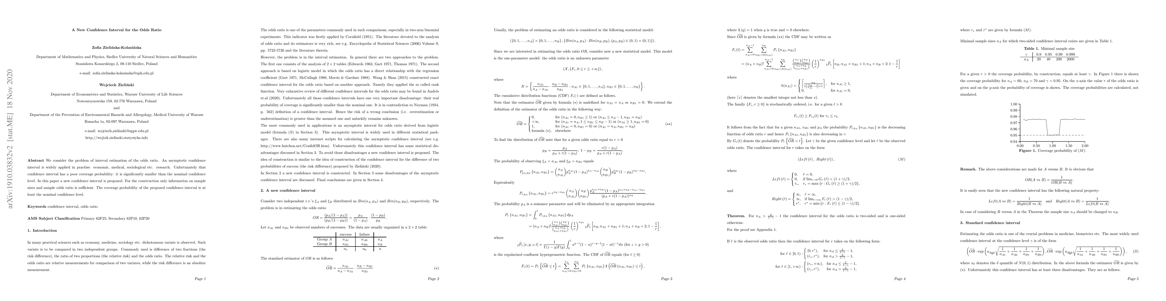 This paper proposes a new confidence interval for estimating the odds ratio, addressing the issue of poor coverage probability in existing asymptotic methods. The new interval guarantees coverage at least equal to the nominal confidence level, requiring only sample sizes and sample odds ratio for its construction.