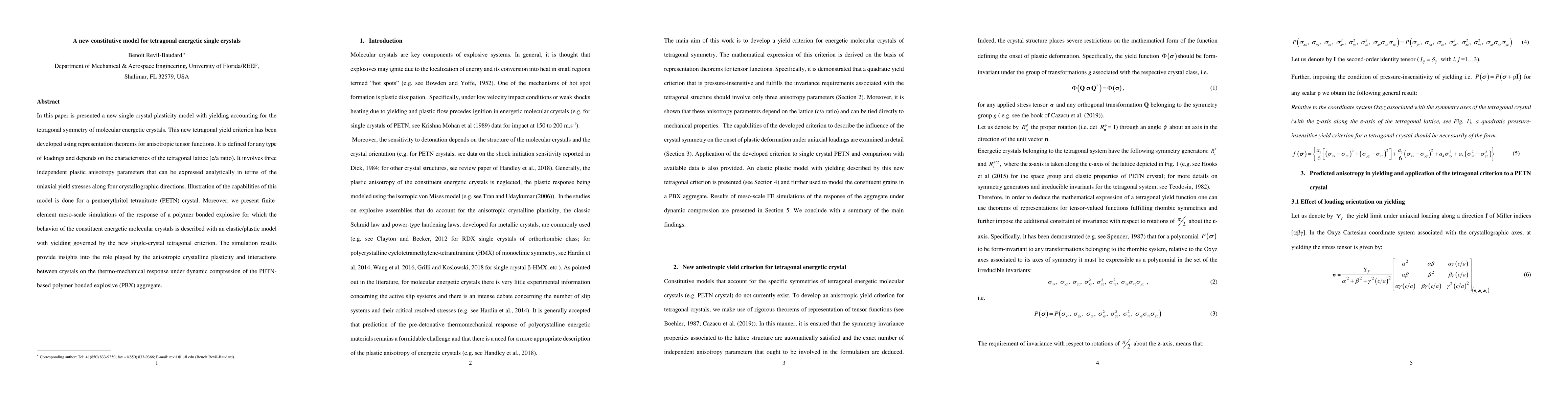 In this paper is presented a new single crystal plasticity model with yielding accounting for the tetragonal symmetry of molecular energetic crystals. This new tetragonal yield criterion has been developed using representation theorems for anisotropic tensor functions. It is defined for any type of loadings and depends on the characteristics of the tetragonal lattice (c/a ratio). It involves three independent plastic anisotropy parameters that can be expressed analytically in terms of the uniaxial yield stresses along four crystallographic directions. Illustration of the capabilities of this model is done for a pentaerythritol tetranitrate (PETN) crystal. Moreover, we present finite-element meso-scale simulations of the response of a polymer bonded explosive for which the behavior of the constituent energetic molecular crystals is described with an elastic/plastic model with yielding governed by the new single-crystal tetragonal criterion. The simulation results provide insights into the role played by the anisotropic crystalline plasticity and interactions between crystals on the thermo-mechanical response under dynamic compression of the PETN-based polymer bonded explosive (PBX) aggregate.