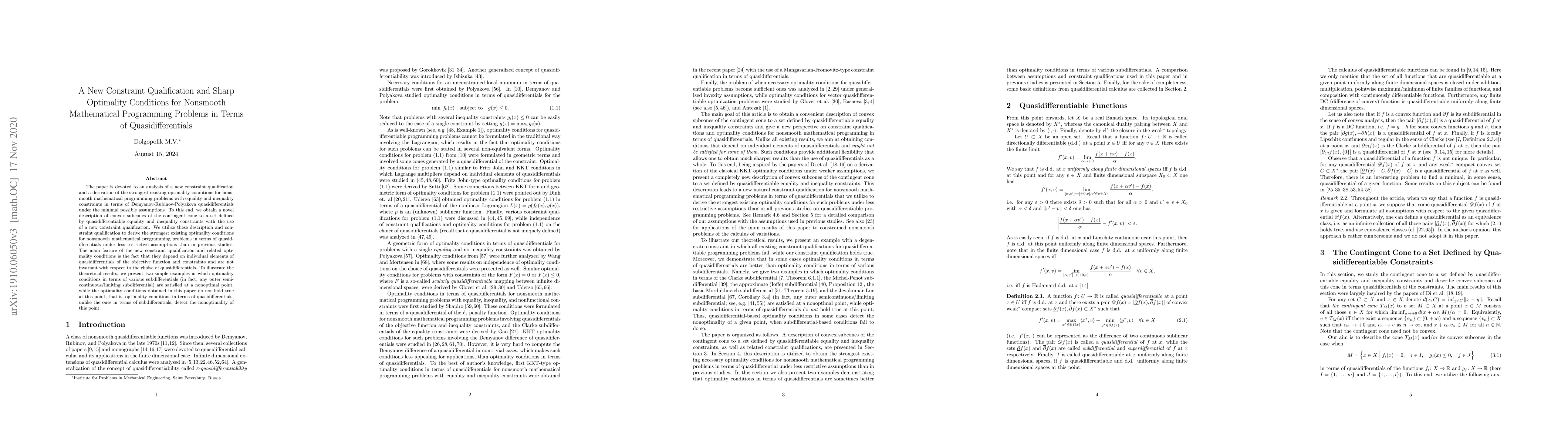 The paper is devoted to an analysis of a new constraint qualification and a derivation of the strongest existing optimality conditions for nonsmooth mathematical programming problems with equality and inequality constraints in terms of Demyanov-Rubinov-Polyakova quasidifferentials under the minimal possible assumptions. To this end, we obtain a novel description of convex subcones of the contingent cone to a set defined by quasidifferentiable equality and inequality constraints with the use of a new constraint qualification. We utilize these description and constraint qualification to derive the strongest existing optimality conditions for nonsmooth mathematical programming problems in terms of quasidifferentials under less restrictive assumptions than in previous studies. The main feature of the new constraint qualification and related optimality conditions is the fact that they depend on individual elements of quasidifferentials of the objective function and constraints and are not invariant with respect to the choise of quasidifferentials. To illustrate the theoretical results, we present two simple examples in which optimality conditions in terms of various subdifferentials (in fact, any outer semicontinuous/limiting subdifferential) are satisfied at a nonoptimal point, while the optimality conditions obtained in this paper do not hold true at this point, that is, optimality conditions in terms of quasidifferentials, unlike the ones in terms of subdifferentials, detect the nonoptimality of this point.