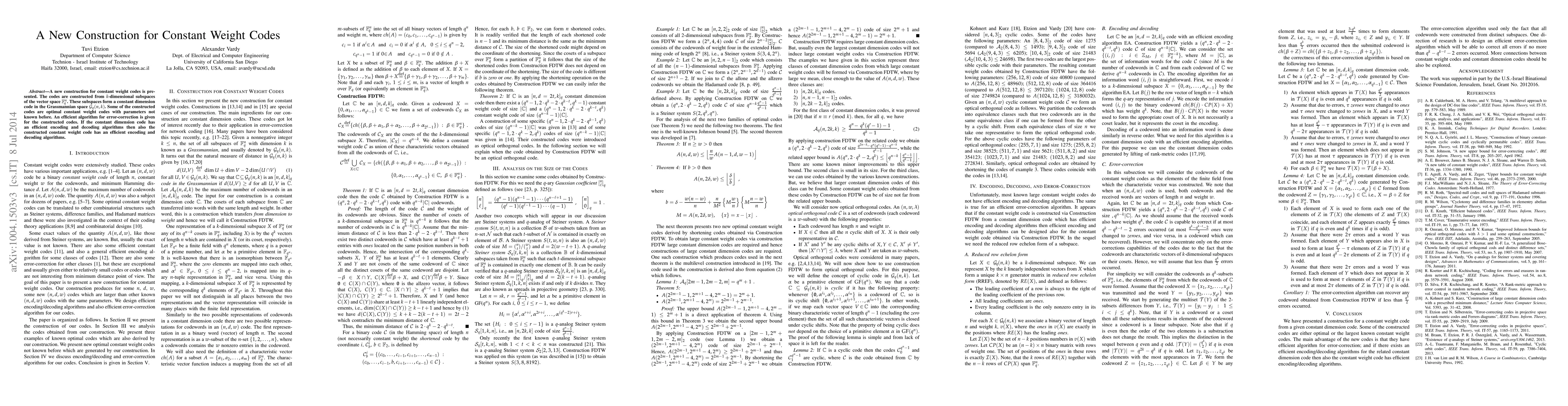A new construction for constant weight codes is presented. The codes are constructed from $k$-dimensional subspaces of the vector space $\F_q^n$. These subspaces form a constant dimension code in the Grassmannian space $\cG_q(n,k)$. Some of the constructed codes are optimal constant weight codes with parameters not known before. An efficient algorithm for error-correction is given for the constructed codes. If the constant dimension code has an efficient encoding and decoding algorithms then also the constructed constant weight code has an efficient encoding and decoding algorithms.